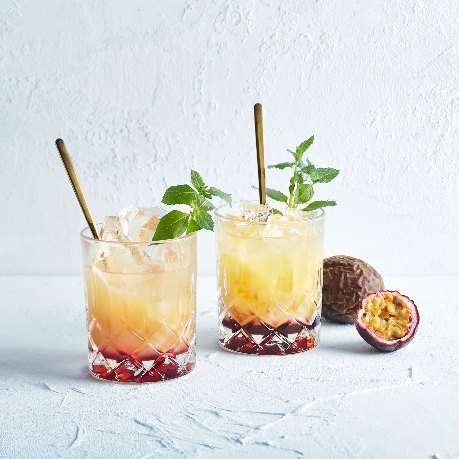 Das Crushed Ice bis zum Glasrand hineingeben und mit Maracujasaft und Ginger Ale auffüllen.