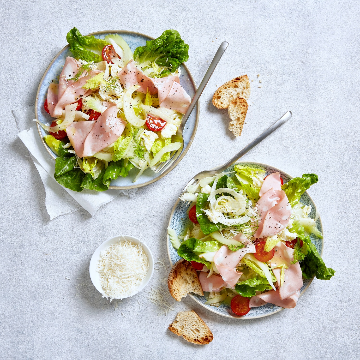 - Knoblauchzehe fein hacken. Zitronensaft mit Salz, Pfeffer, Zucker, Knoblauch, Parmesan mischen und mit Olivenöl zu einem Dressing aufschlagen. Dressing zu den Salatzutaten geben und mischen.