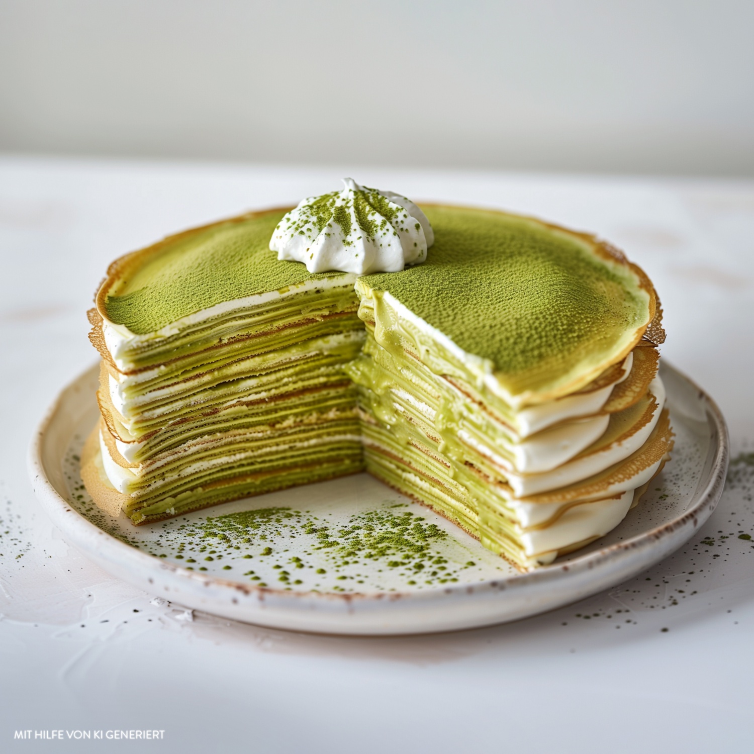 Ein echter Eyecatcher für die Kaffeetafel: Die grünen Matcha-Crêpes werden hier mit einer Sahneschicht zu einer köstlichen Torte gestapelt. Zum Rezept