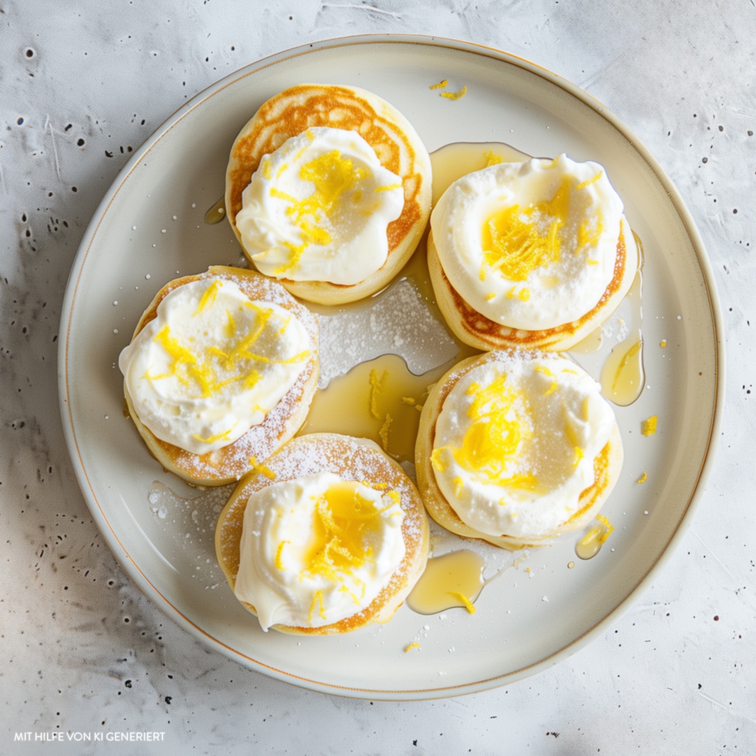 - Die Pancakes auf Tellern anrichten, mit der Zitronen-Ricotta-Creme toppen und mit Ahornsirup, den restlichen Zitronenabrieb und etwas Puderzucker garnieren.