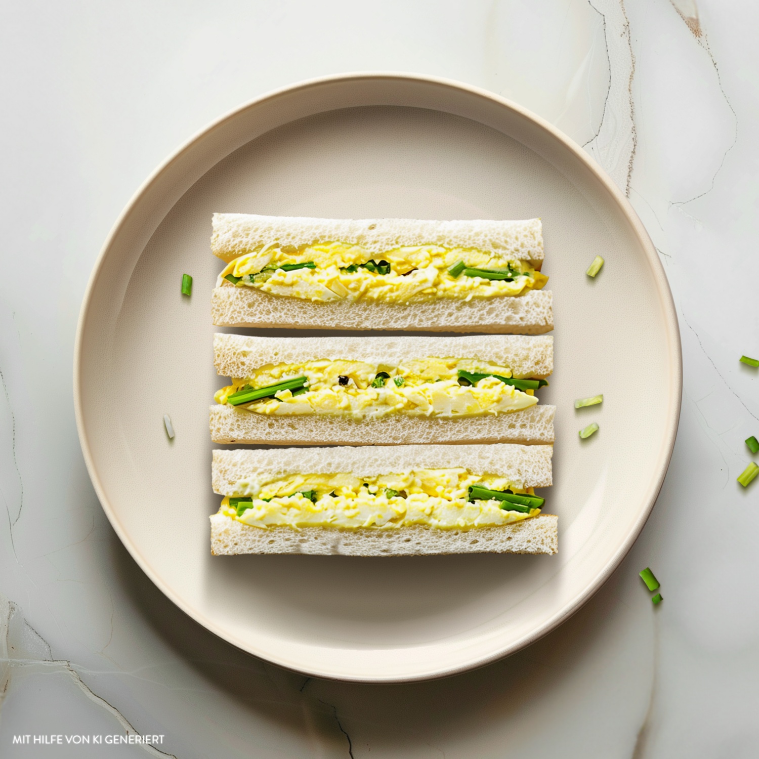 - Die Brotscheiben dünn mit Butter bestreichen und den Eiersalat gleichmäßig auf vier Brotscheiben verteilen. Die restlichen Brotscheiben darauflegen und die Sandwiches leicht zusammendrücken.