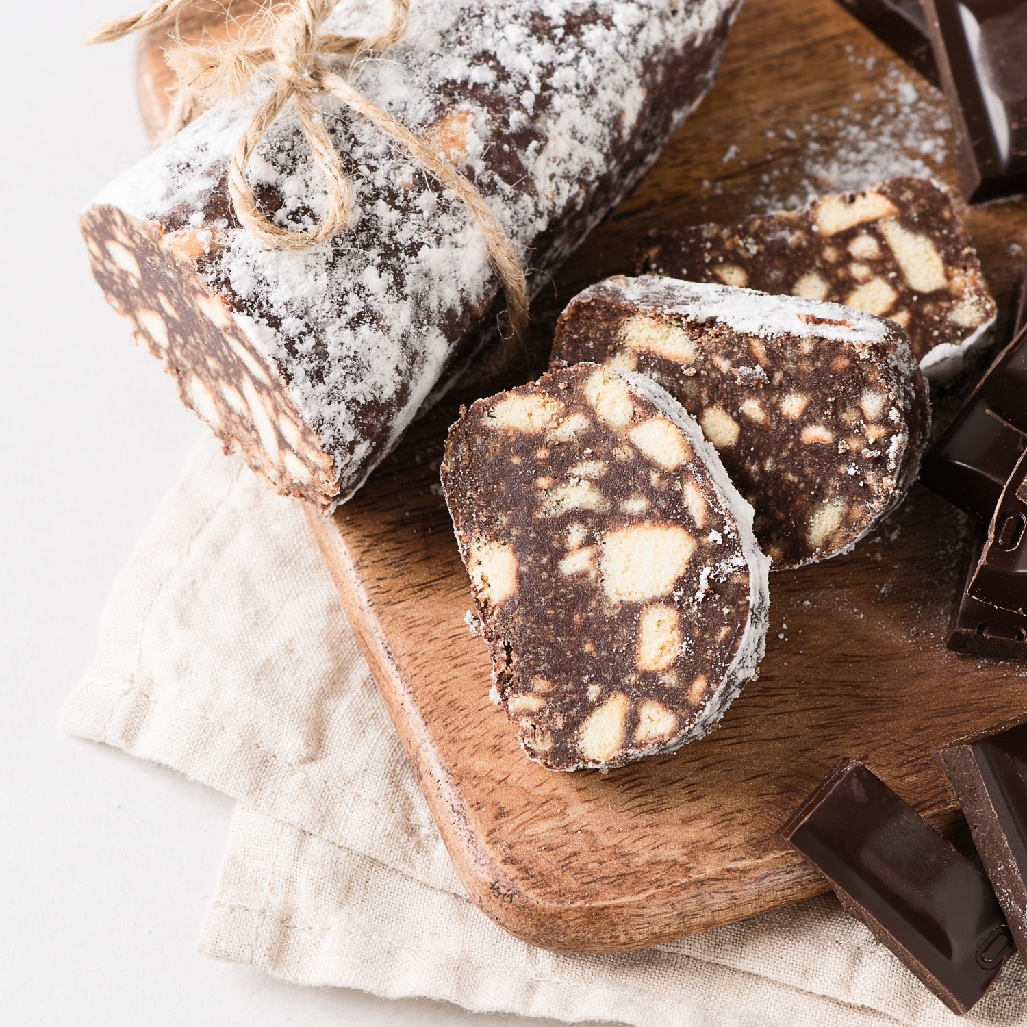 3. Daraus zwei lange Würste formen. Auf Backpapier abkühlen und hart werden lassen. Die Schokoladensalami kann jetzt wie richtige Salami in Scheiben geschnitten und genascht werden.