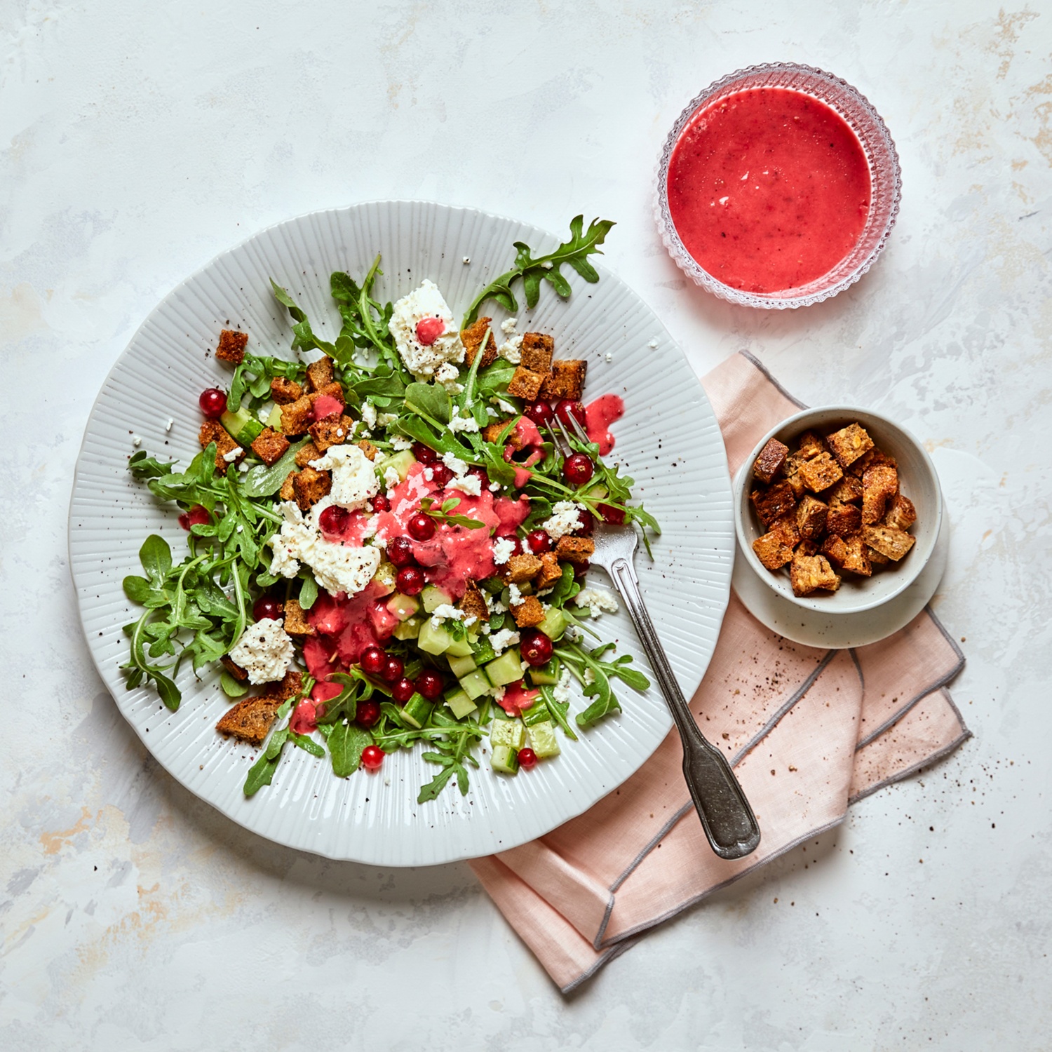 - Den Rucola, die Gurke, die Johannisbeeren und die Croutons mischen. Den Feta darüber krümeln. Mit dem Johannisbeersaft-Dressing servieren.