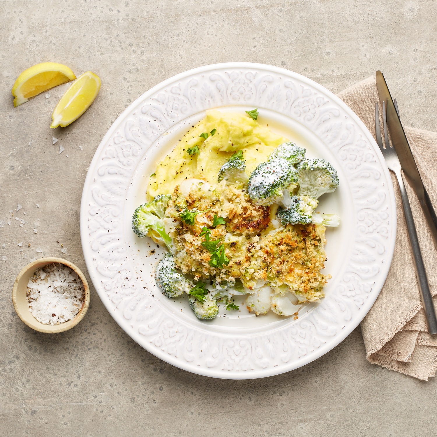 - Den Kabeljau mit Brokkoli-Käsekruste bei 200 °C Ober- und Unterhitze (180 °C Umluft) 20–25 Minuten im Ofen backen. Zusammen mit dem Kartoffelstampf auf den Tellern anrichten.