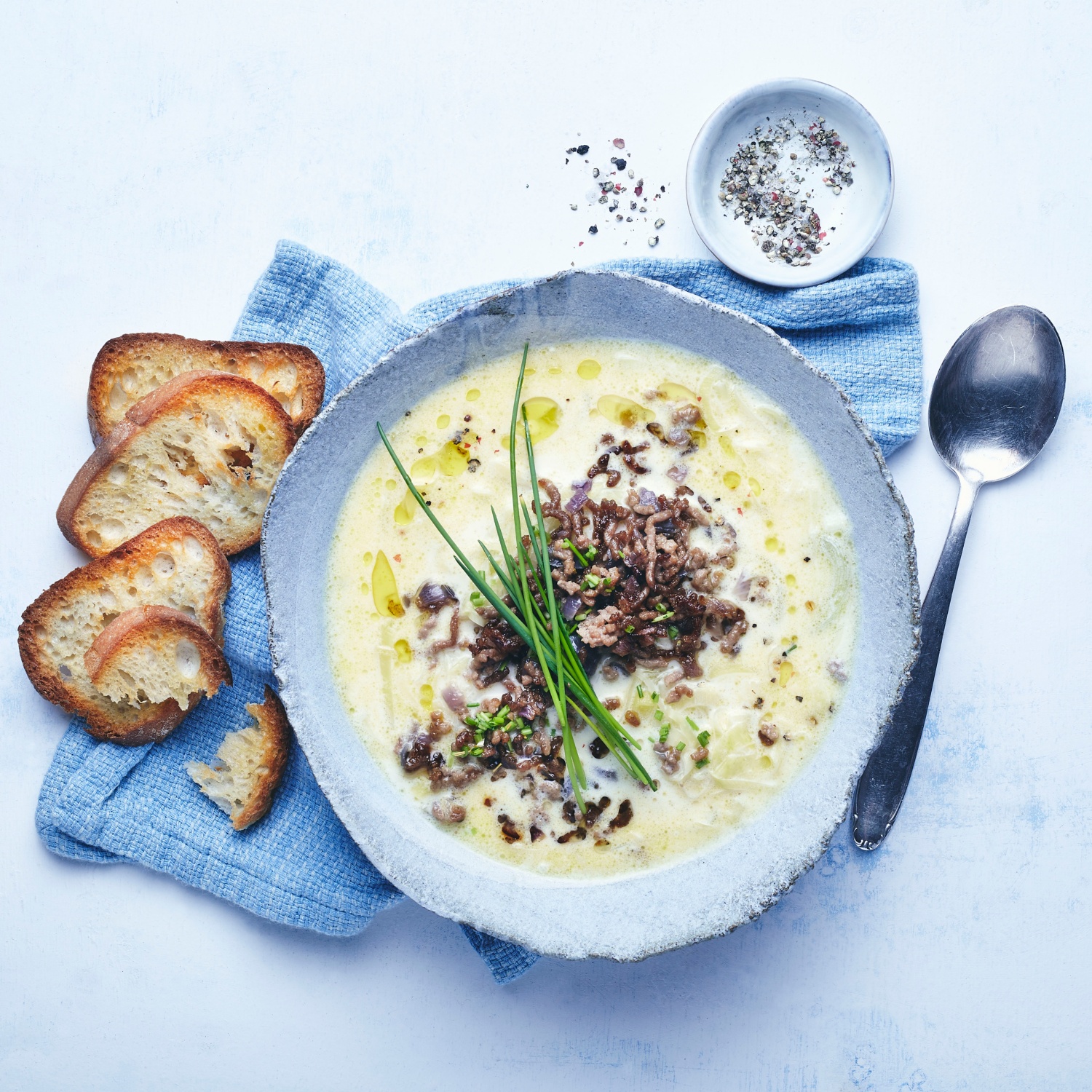 Käse-Lauchsuppe mit Hackfleisch und geröstetem Baguette
