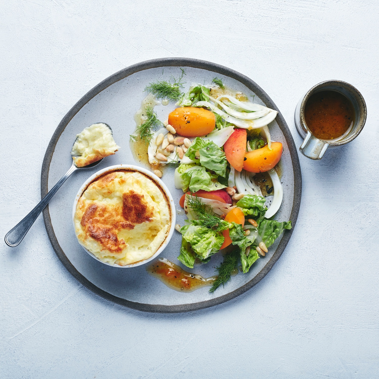 Käsesoufflé mit Aprikosen-Fenchelsalat