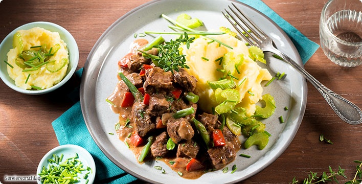 - Das Kalbsgulasch zusammen mit dem Staudensellerie-Kartoffelpüree servieren.
