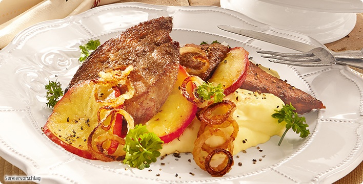 - Apfel waschen und mit Schale in Scheiben schneiden. Scheiben mit Butter im Bratfett braten. Mit 1 EL Zucker bestreuen, damit der Apfel schön karamellisiert. Zwiebeln in feine Ringe hobeln und in Mehl wenden. In 2 EL heißem Öl kross braten. Mit Salz, Pfeffer und 1 TL Zucker würzen. Dazu passt ein feines, lockeres Kartoffelpüree.