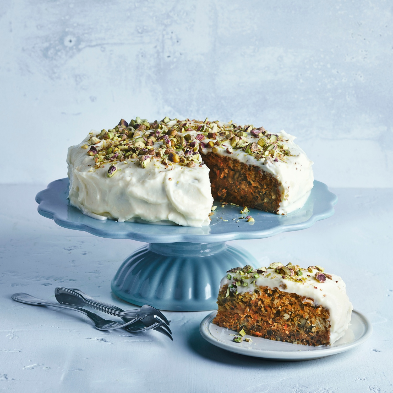 - Das Frischkäse-Topping aus dem Kühlschrank nehmen, gleichmäßig auf dem vollständig ausgekühlten Kuchen verteilen und glattstreichen. Den Karottenkuchen mit den gehackten Pistazien garnieren und bis zum Servieren kaltstellen.