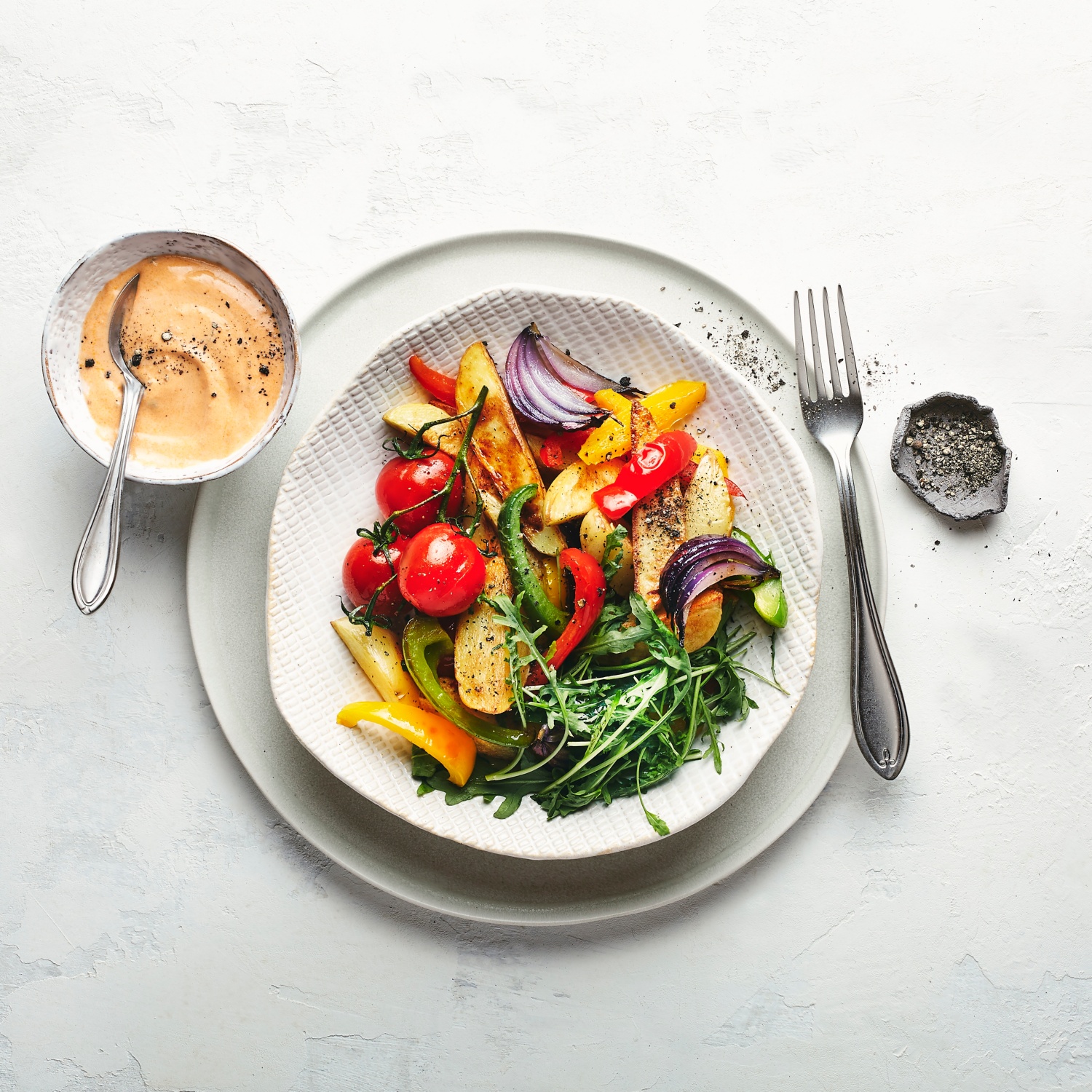 Vegetarisch einfach genießen! Die Kartoffeln werden im Ofen innen schön weich und außen knusprig. Paprika und Tomaten geben diesem Ofengericht den Frischekick. Dazu passt die cremige Joghurtsauce. Zum Rezept