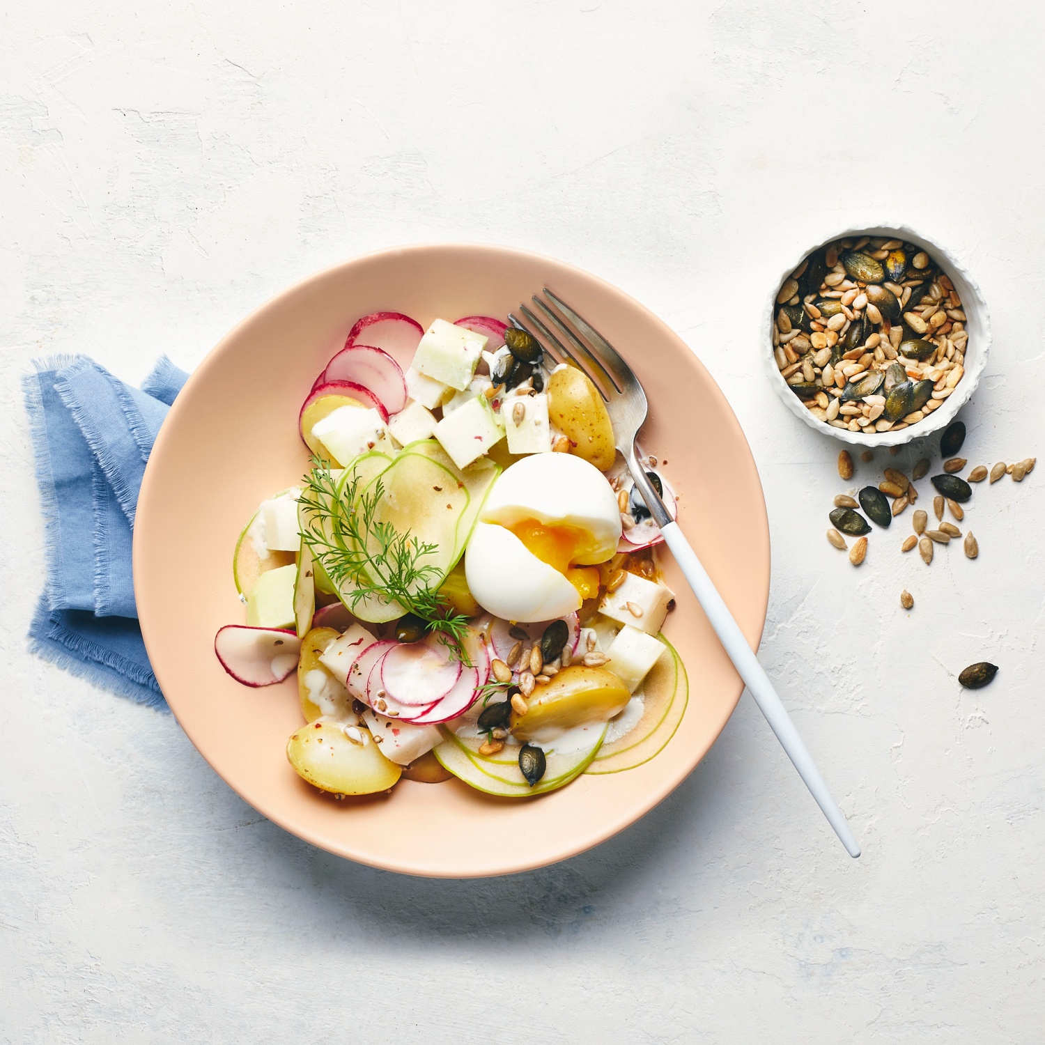 Eine moderne Interpretation des beliebten Klassikers: Diese Kartoffel-Bowl mit Kohlrabi, Radieschen und Ei erinnert steckt voller Raffinesse. Die Apfelscheiben geben diesem etwas anderen Kartoffelsalat einen fruchtigen Touch. Zum Rezept