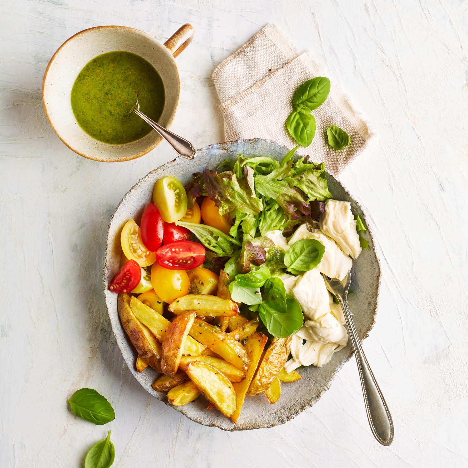 - In einer großen Schüssel Salat, Tomaten, Mozzarella und Kartoffeln vermengen und mit dem Dressing servieren. Mit Basilikumblättern garnieren.