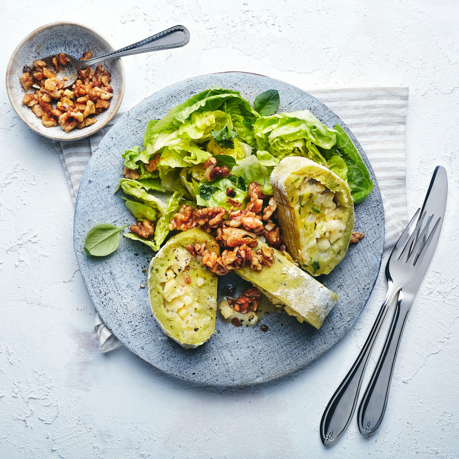 Ein Yummi-Gericht aus dem Ofen: Die Kartoffelroulade wird mit Gorgonzola und Äpfeln gefüllt und mit gerösteten Walnüssen bestreut serviert. Zum Rezept