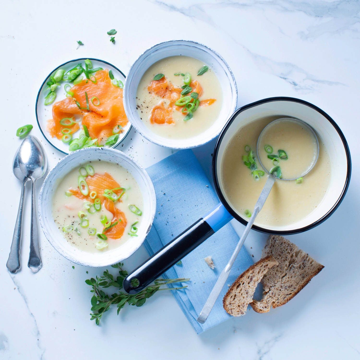 - Den Räucherlachs in schmale Streifen schneiden. Die Kartoffelsuppe portionieren. Die Lachsstreifen auf die Suppen verteilen und mit den Frühlingszwiebeln bestreut servieren.