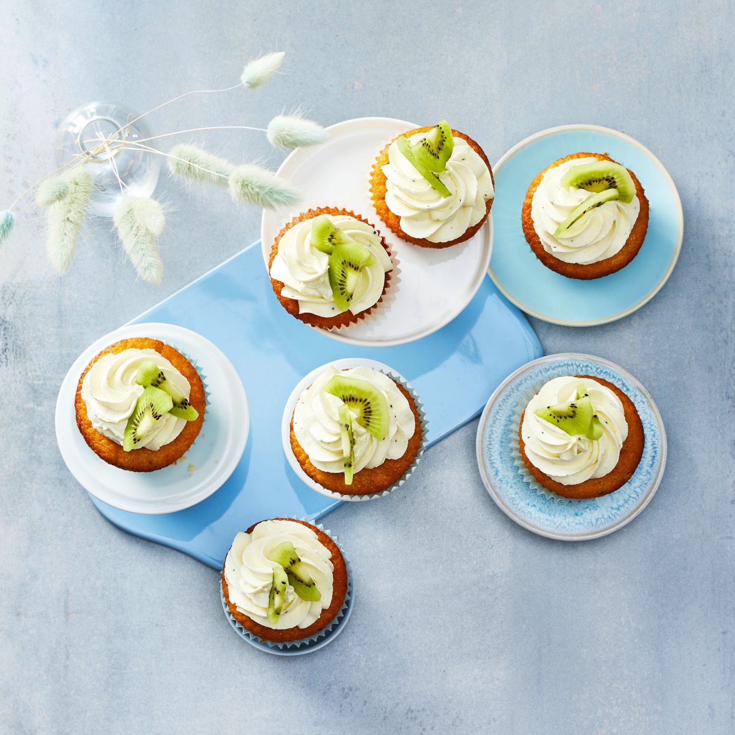- Frosting in einen Spritzbeutel mit großer Sterntülle füllen und kreisförmig als Tuff auf die Cupcakes spritzen. 1 Kiwi schälen, in Scheiben schneiden und halbieren. Halbierte Kiwi-Scheiben kurz vor dem Servieren zur Dekoration in das Frosting stecken.