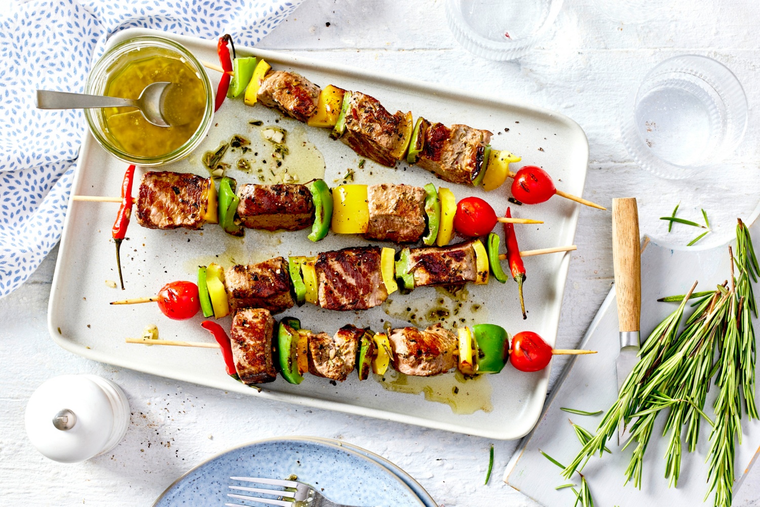 - Paprika in Streifen schneiden. Je 1 Peperoni auf die Spieße, dann abwechselnd Lammfleisch und Paprikastreifen, zum Abschluss 1 Tomate.