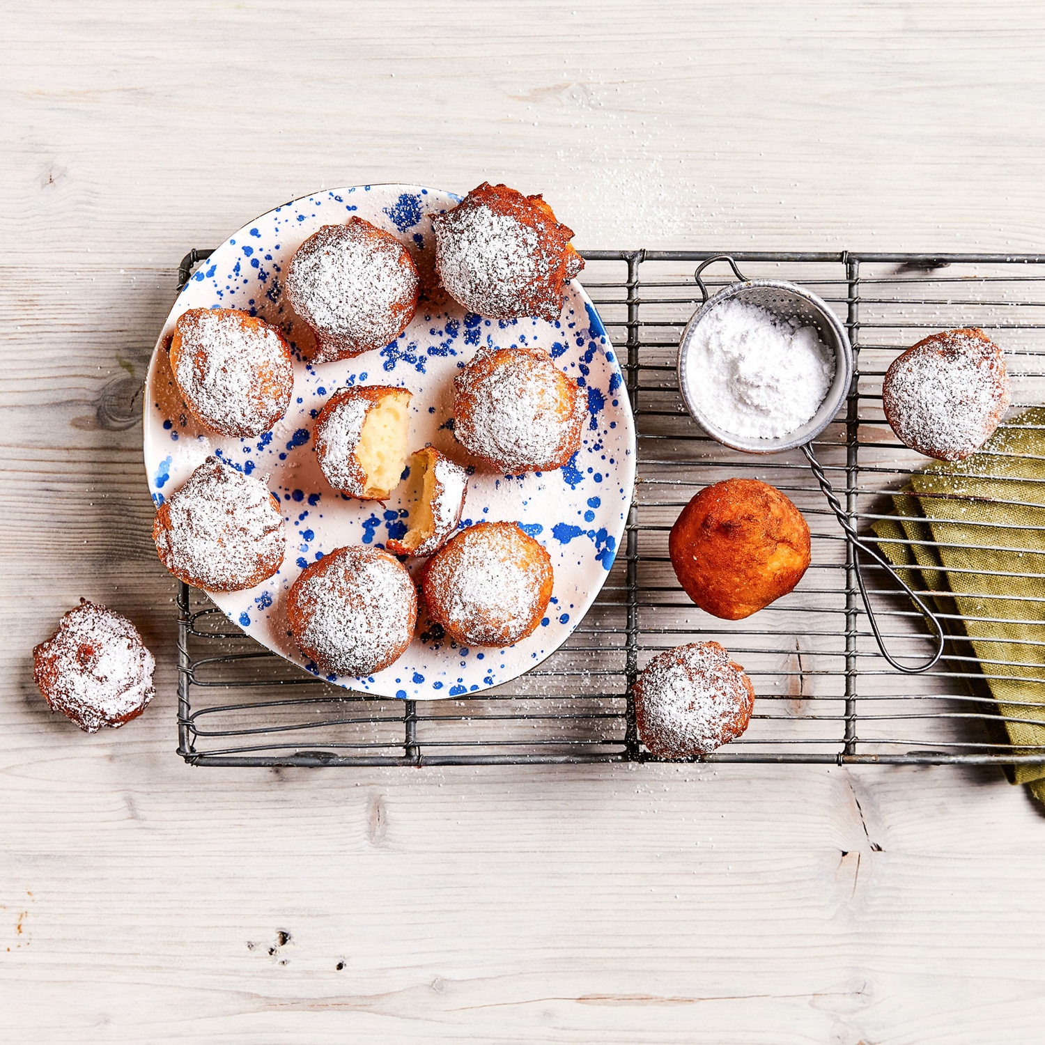 - Das Pflanzenöl in einem hohen Topf auf 170 °C erhitzen. Aus dem Teig mithilfe eines Teelöffels Bällchen abstechen und portionsweise in das heiße Öl gleiten lassen. Die Bällchen unter Wenden 2 bis 4 Minuten goldbraun ausbacken, mit einer Schaumkelle herausnehmen und auf Küchenpapier abtropfen lassen.