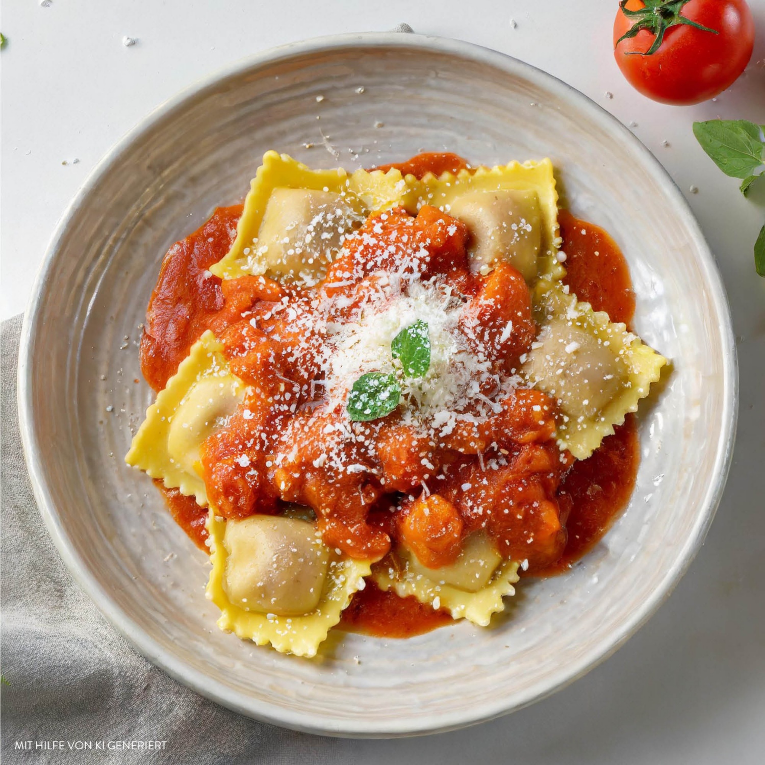 - Serviere die Ravioli auf einem Teller, übergieße sie großzügig mit der Tomatensauce und garniere mit frisch geriebenem Parmesan.