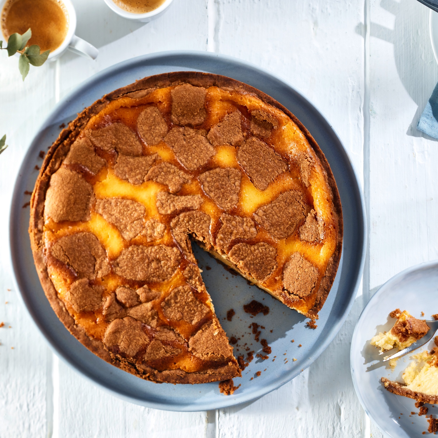 - Für die Füllung Butter oder Margarine, Speisequark, Zucker, Eier und Puddingpulver mit einem Handrührgerät (Schneebesen) miteinander verrühren, bis eine gleichmäßige Masse entsteht. Die Masse auf dem in der Springform befindlichen Boden füllen und glattstreichen. Den restlichen Teig in kleine Stücke zupfen und auf der Füllung verteilen.