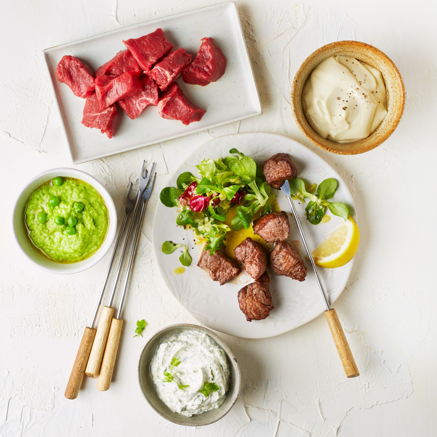 Klassisches Fleischfondue mit Wintersalaten und 3 Dips