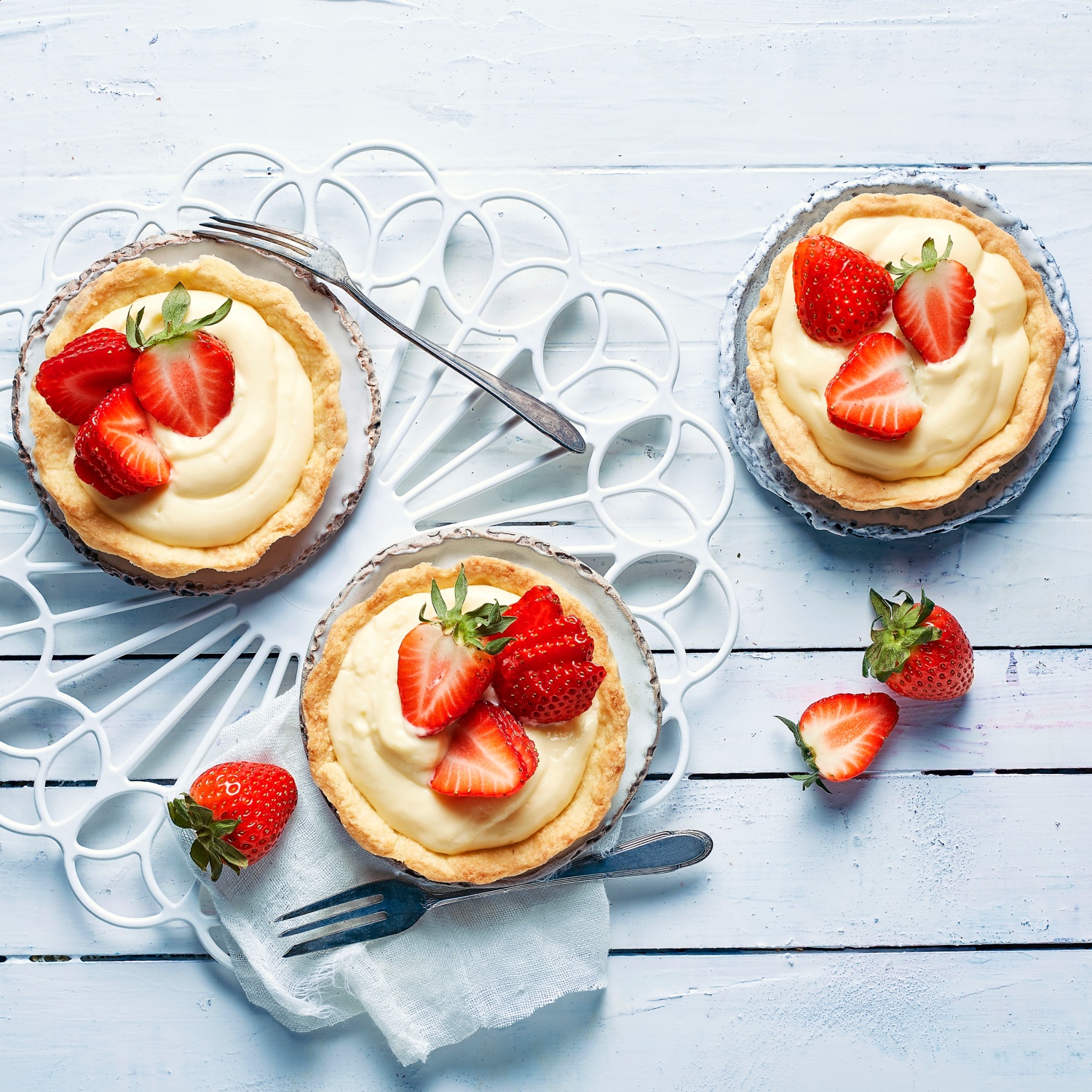 7. Die Vanillecreme in die Tartelettes füllen. Erdbeeren waschen und halbieren. Die Tartelettes mit den Erdbeeren belegen.