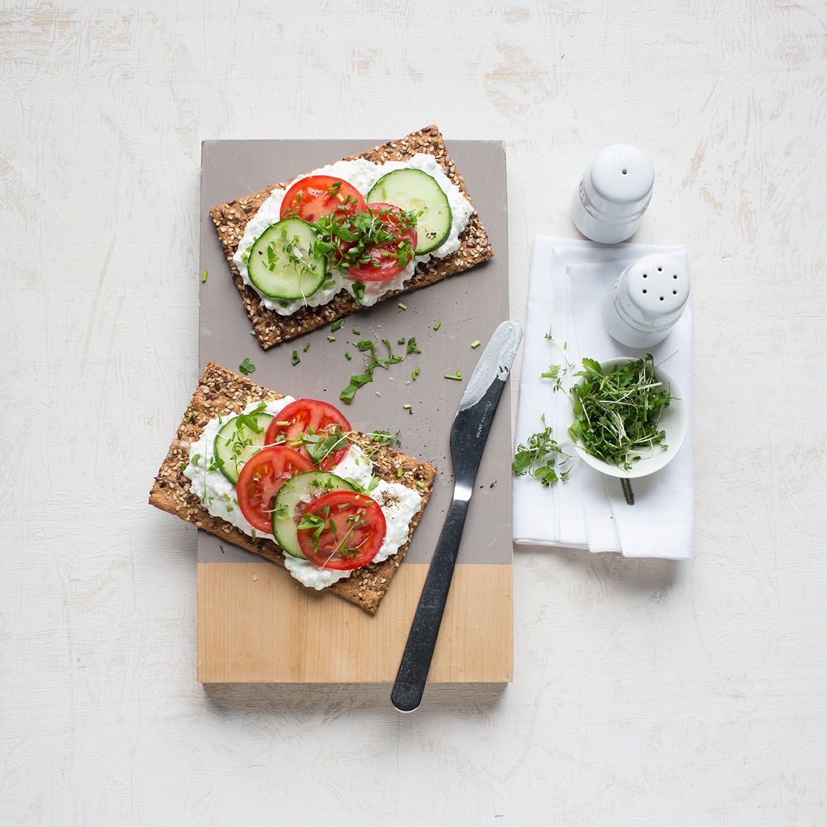 Das Knäckebrot mit dem körnigen Frischkäse Hüttenkäse und salzen.