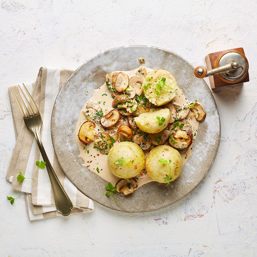 Die fertigen Semmelknödel mit dem Pilzragout auf Tellern anrichten und mit der übrigen Petersilie bestreut servieren.