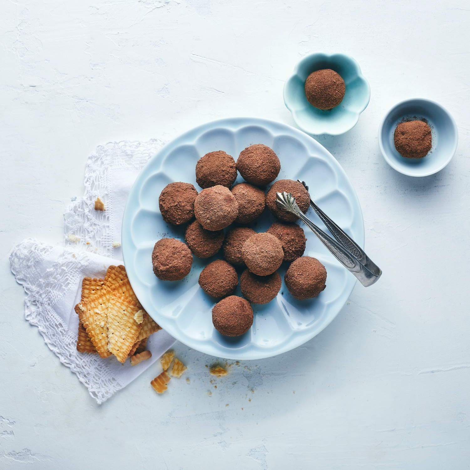 - Die Pralinenmasse aus dem Kühlschrank nehmen, mit den Handflächen zu runden Kugeln formen und im Kakaogetränkepulver wälzen.