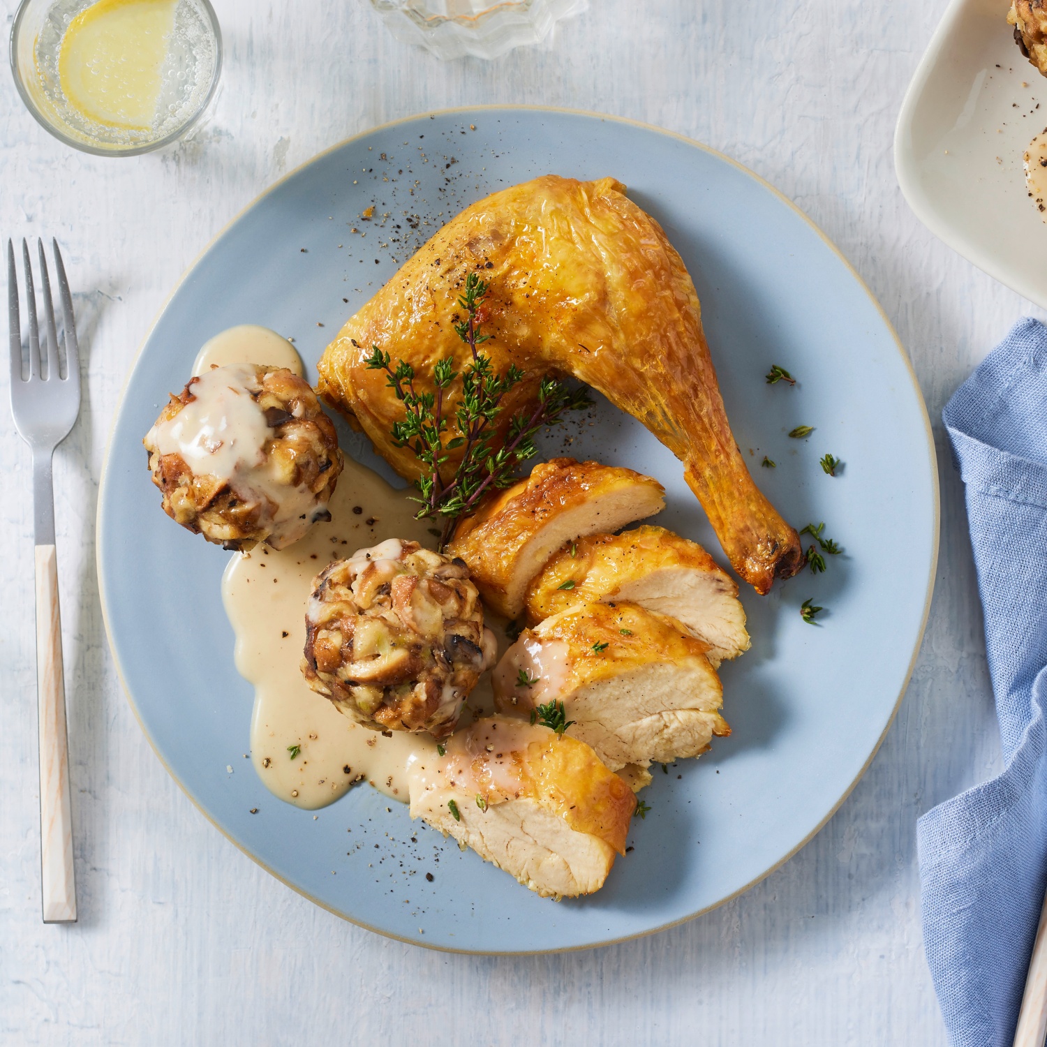 Knusprige Maispoularde mit Pilzknödeln und Rahmsauce