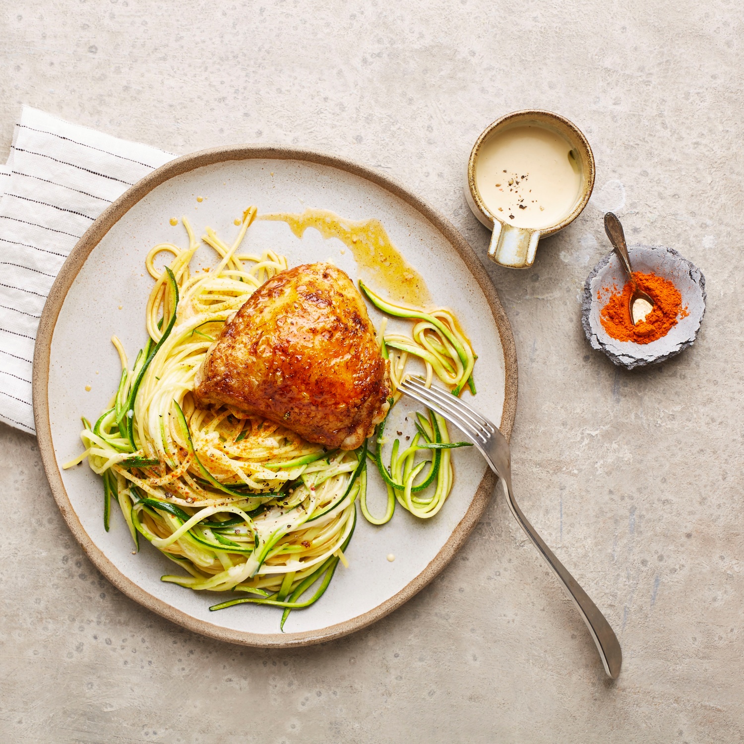 - Die Zucchini putzen, waschen und in Streifen schneiden oder hobeln. Die Butter in einer beschichteten Pfanne erhitzen. Die Zucchinistreifen darin ca. 2 Minuten dünsten. Mit Salz und Pfeffer würzen. Die Nudeln abgießen, abtropfen lassen und zu den Zucchinistreifen geben. Die Gemüsenudeln auf den Teller verteilen. Das Paprika-Hähnchen darauf anrichten. Die Nudeln mit der Frischkäsesoße beträufeln.