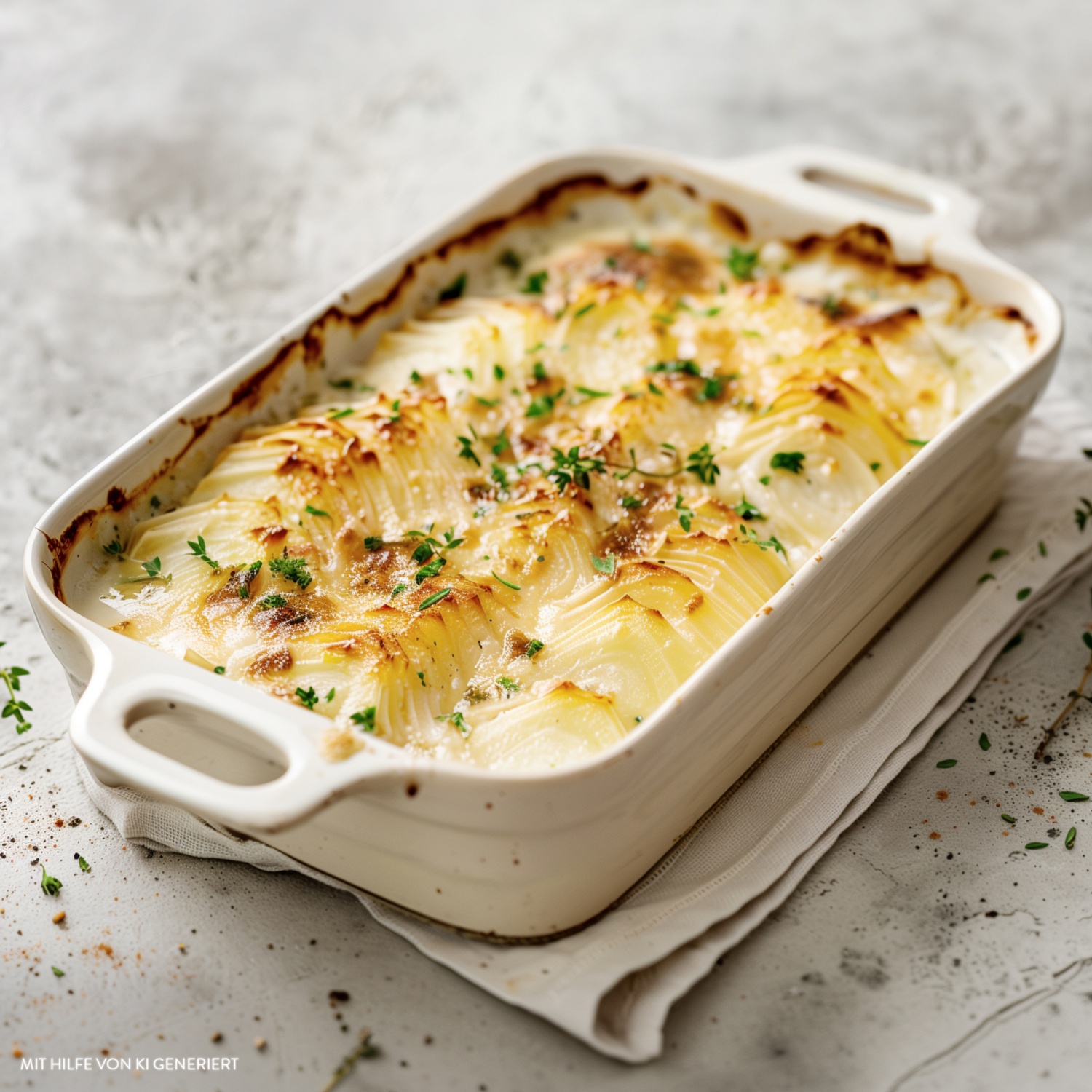 - Das Kohlrabi-Gratin vor dem Servieren mit frisch gehackter Petersilie garnieren.