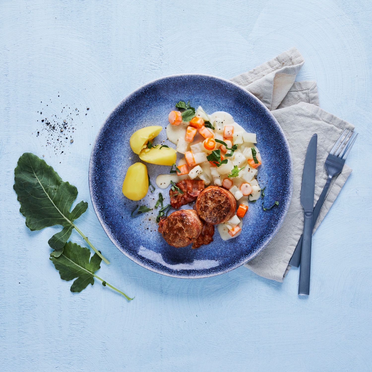 Kohlrabi-Schmand-Gemüse mit speckumwickelten Frikadellen