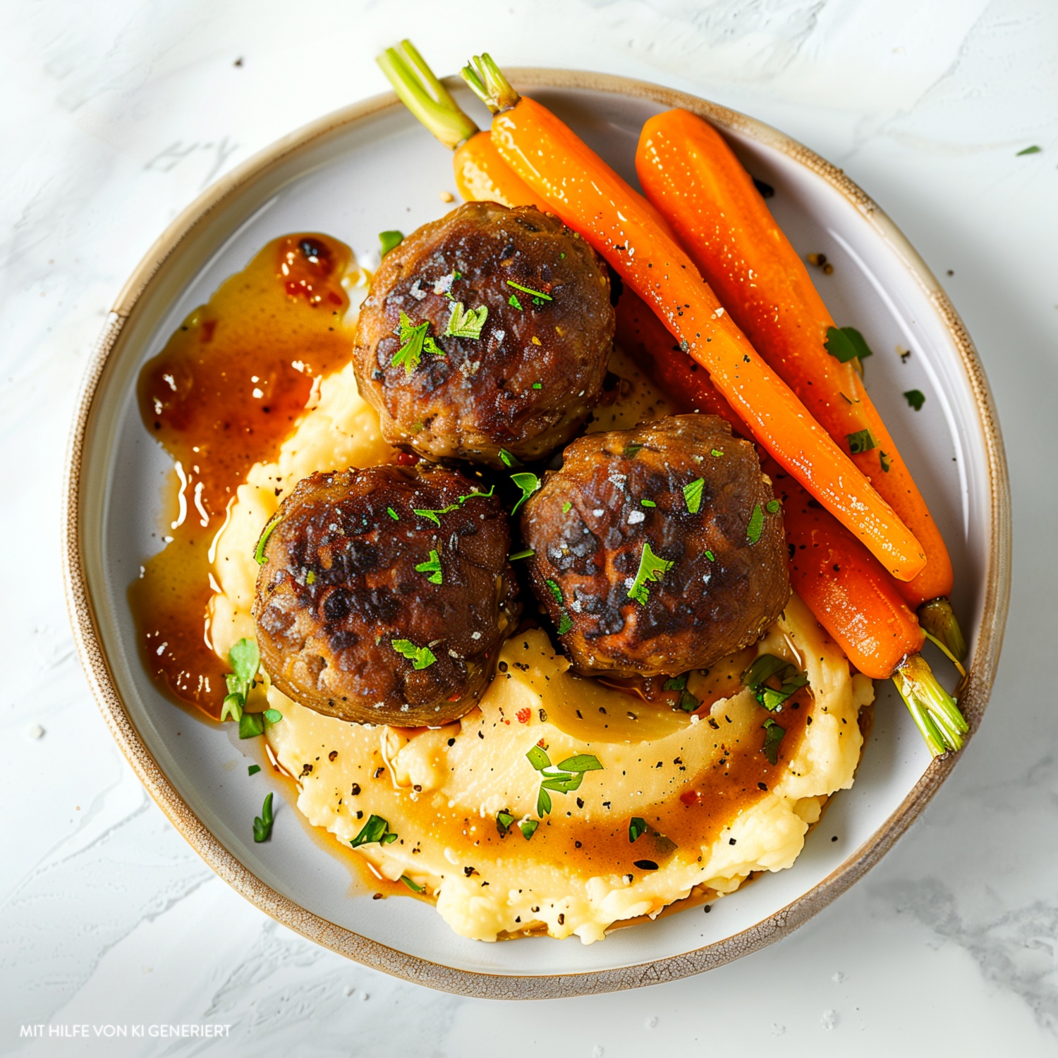 Kohlrabi-Stampf mit Frikadellen, glasierten Möhren und Bratensauce