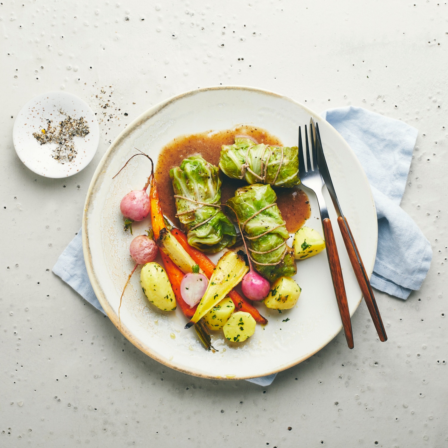- Wenn die Kohlrouladen fertig sind, die Flüssigkeit mit etwas Stärke andicken und mit Salz und Pfeffer abschmecken. Die Rouladen mit der Sauce, den Kartoffeln und dem Wurzelgemüse reichen.