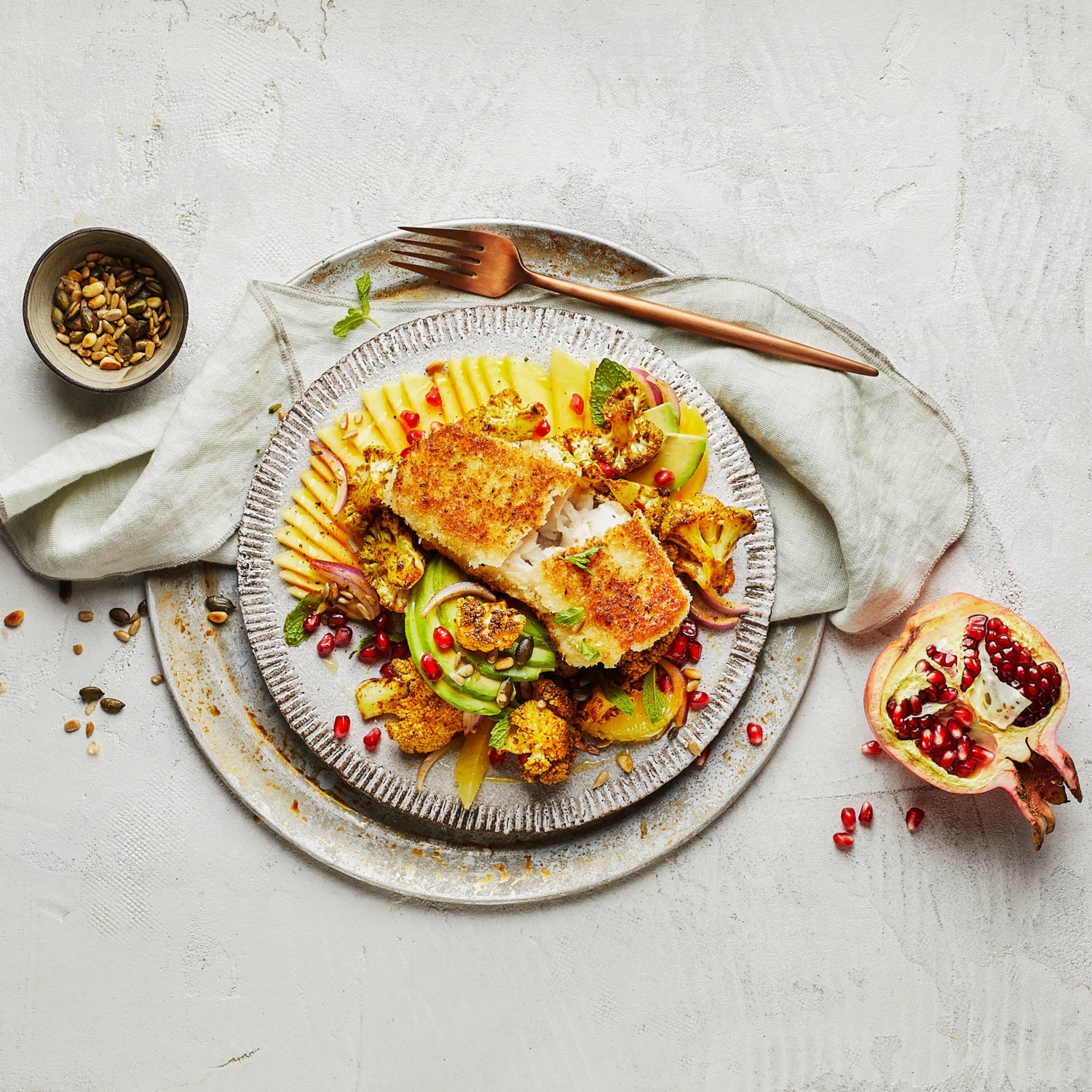 - Die Mango, die Avocado und die Orangen zusammen anrichten. Den gebackenen Blumenkohl, die Kerne, die Minze, die Zwiebel und die Granatapfelkerne darübergeben.