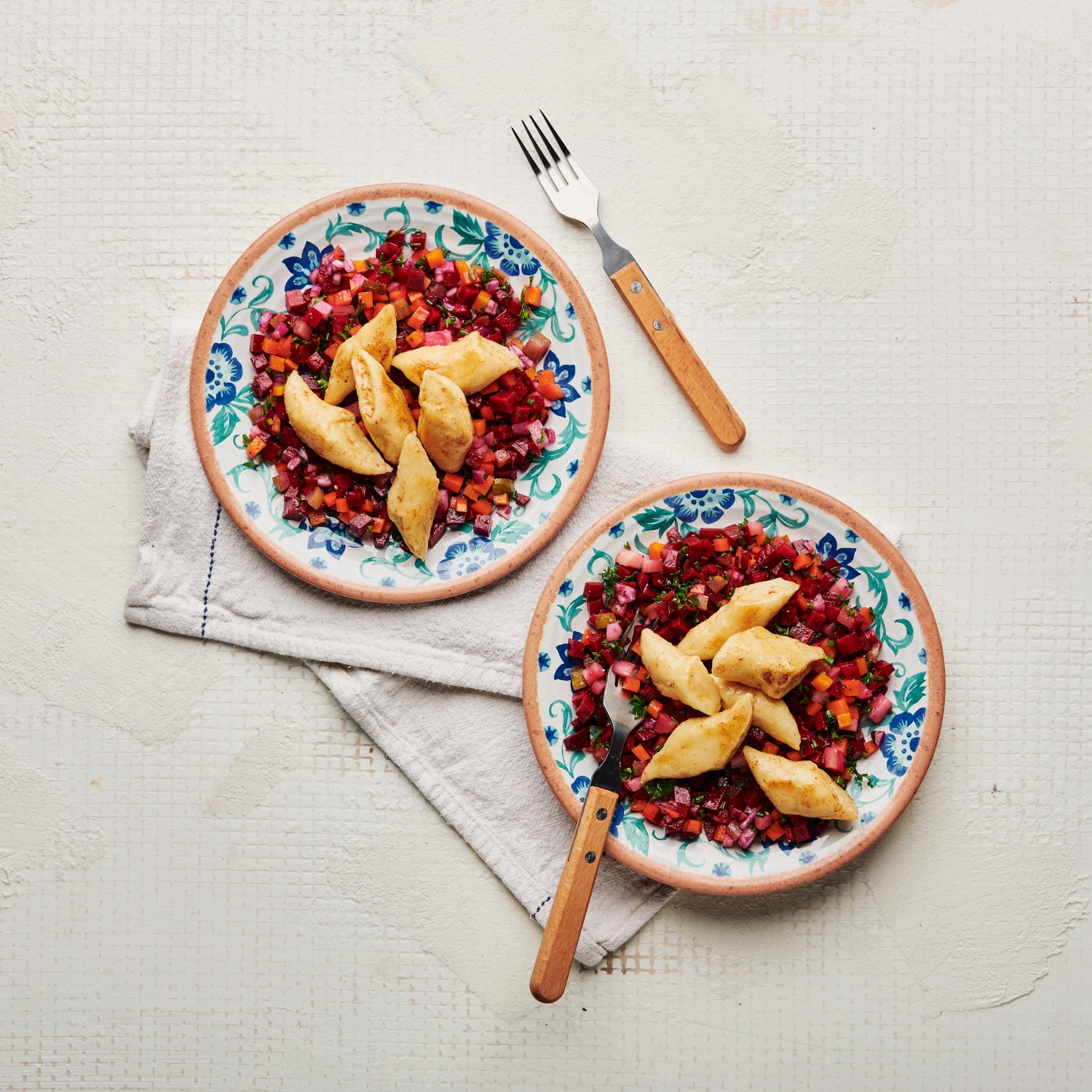 Eckige polnische Gnocchi, so kann man Kopytka am besten beschreiben. Die Kartoffelklöße mit Rote-Bete-Salat sind ein nahrhaftes und leckeres Rezept. Zum Rezept