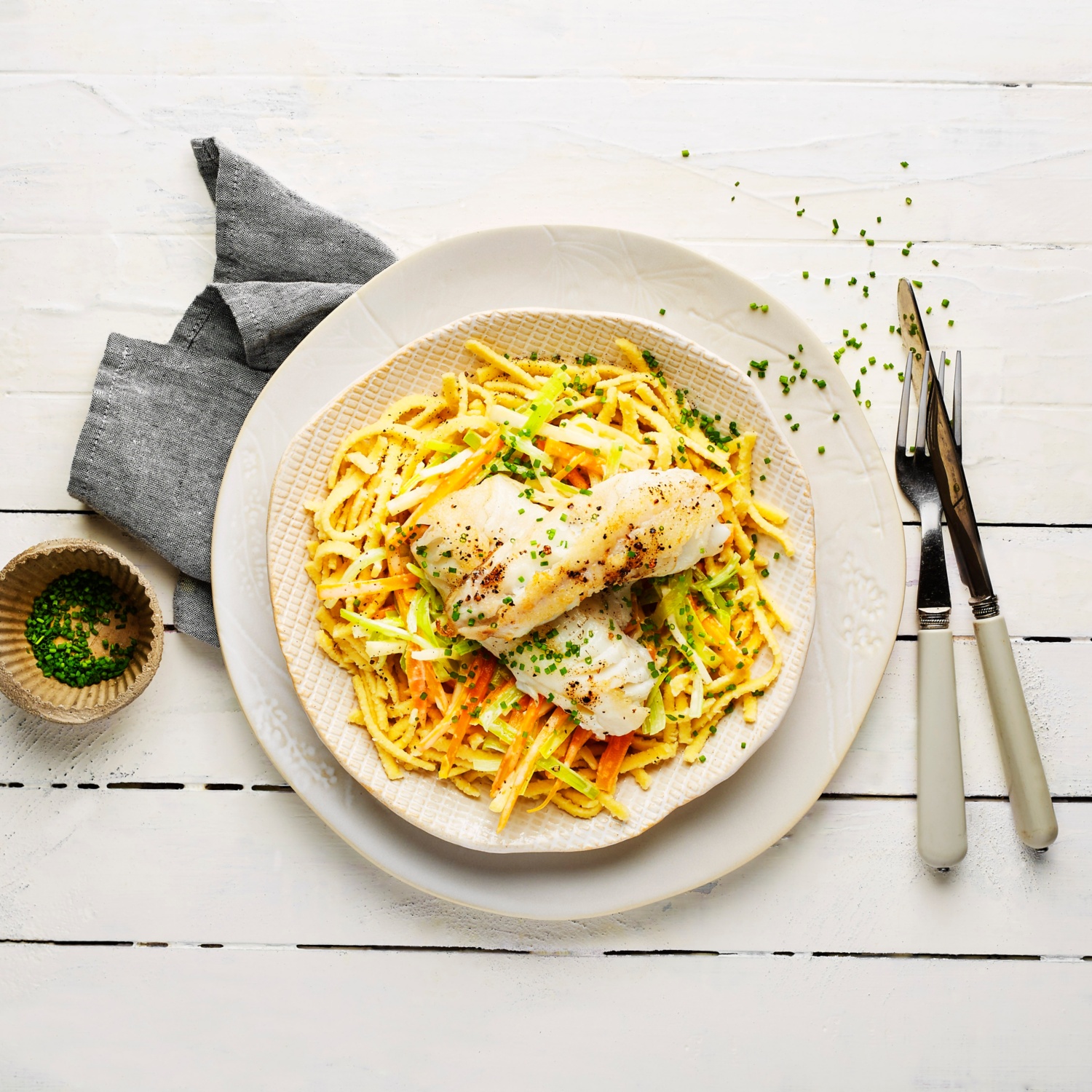 Kross gebratener Zander mit Gemüsestreifen und Spätzle
