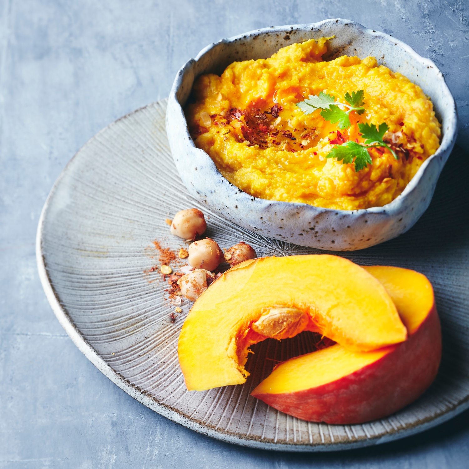 Winterzeit ist Kürbiszeit und Kürbis-Hummus ist so einfach wie lecker. Das orange leuchtende Wintergemüse gibt der orientalischen Spezialität den richtigen Pep. Zum Rezept