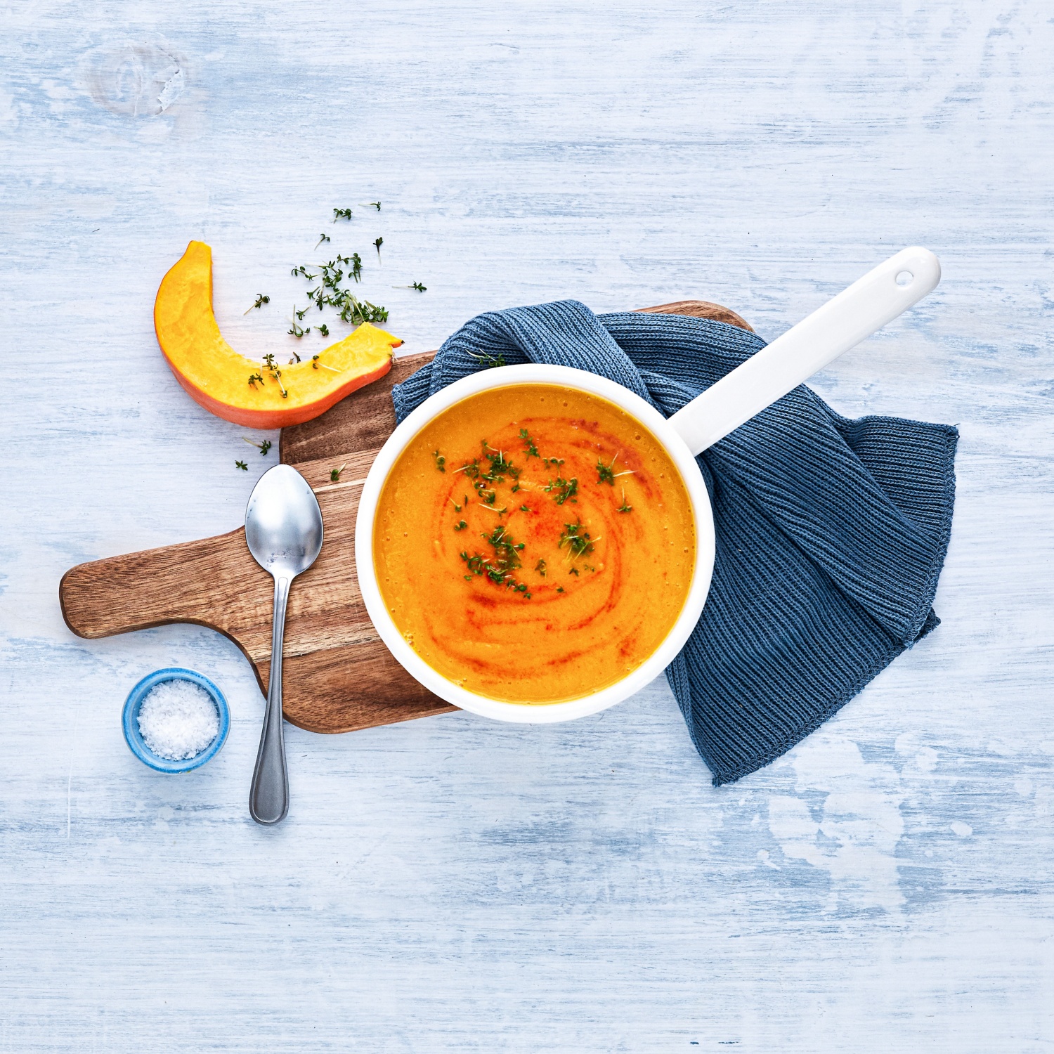 - Die Kürbis-Ingwer-Suppe pürieren und mit Salz, Pfeffer und Paprikapulver abschmecken. Mit etwas Gartenkresse garniert servieren.