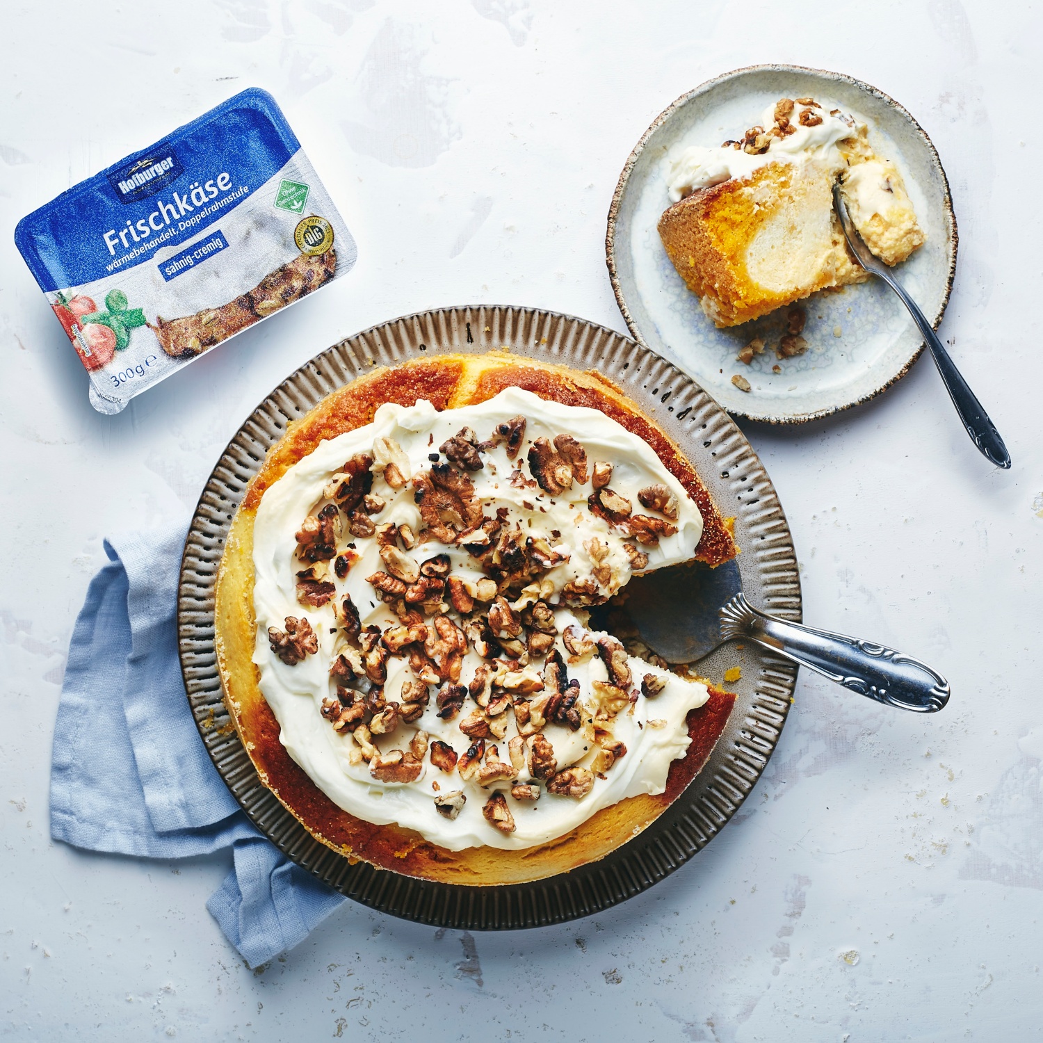 Der perfekte Käsekuchen zur Herbstsaison: Luftiger Quarkteig mit Kürbispüree getoppt mit einem cremigen Frischkäse-Frosting und knackigen Walnusskernen. Zum Rezept