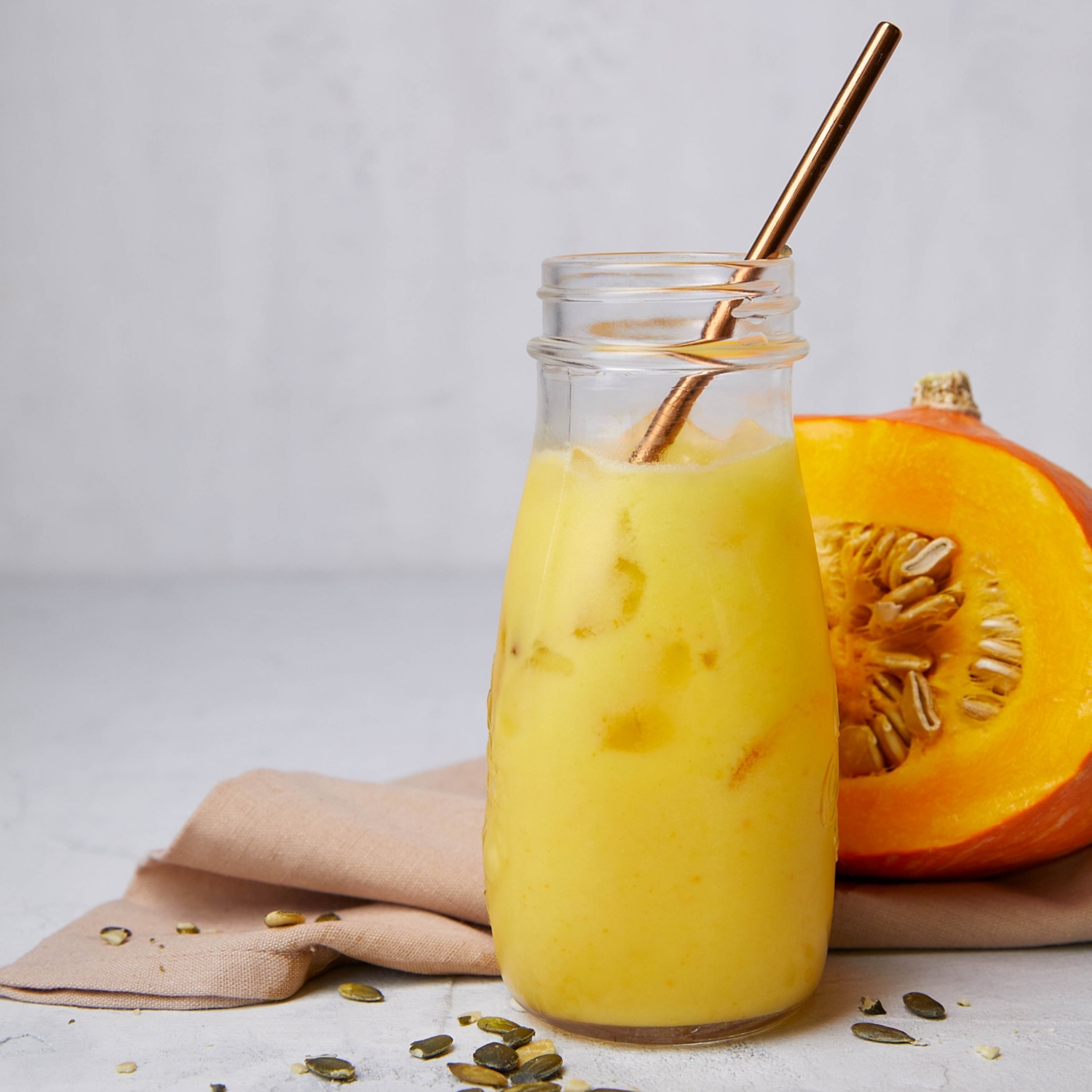 Eine Mango schälen und das Fruchtfleisch vom Stein schneiden. Die Kürbis- und Mangowürfel mit dem Joghurt, der Milch (oder dem Pflanzendrink) und dem Vanillinzucker in einem Mixer cremig pürieren.
