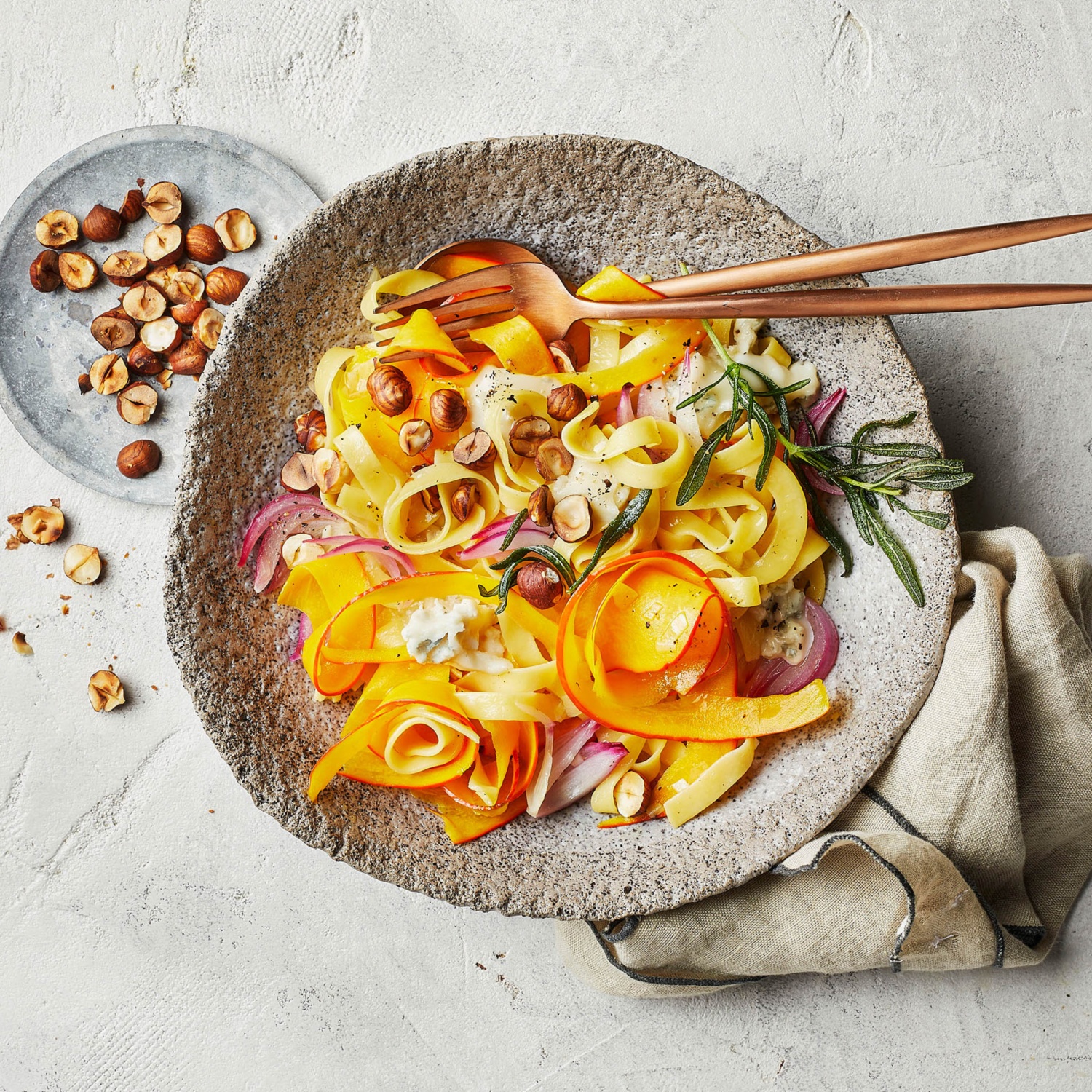 Die köstliche Kombination aus herbstlicher Kürbispasta, cremigem Gorgonzola und knackigen Haselnüssen lassen Foodie-Herzen höher schlagen. Zum Rezept