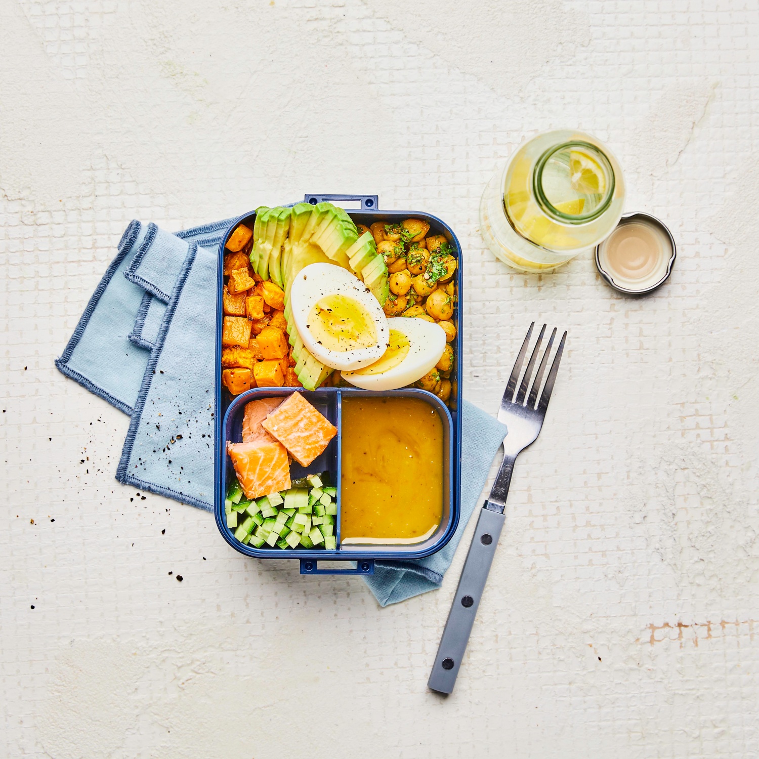 - Die Süßkartoffel, den Lachs, die Gurke, die Avocado und die Kichererbsen auf vier Lunchboxen oder -dosen verteilen. Die Honig-Senf-Sauce in einer kleinen Extra-Dose oder einem Extrafach transportieren und vor dem Essen über die Bowl geben. Die Eier vor dem Servieren schälen, halbieren und auf die Bowl geben.