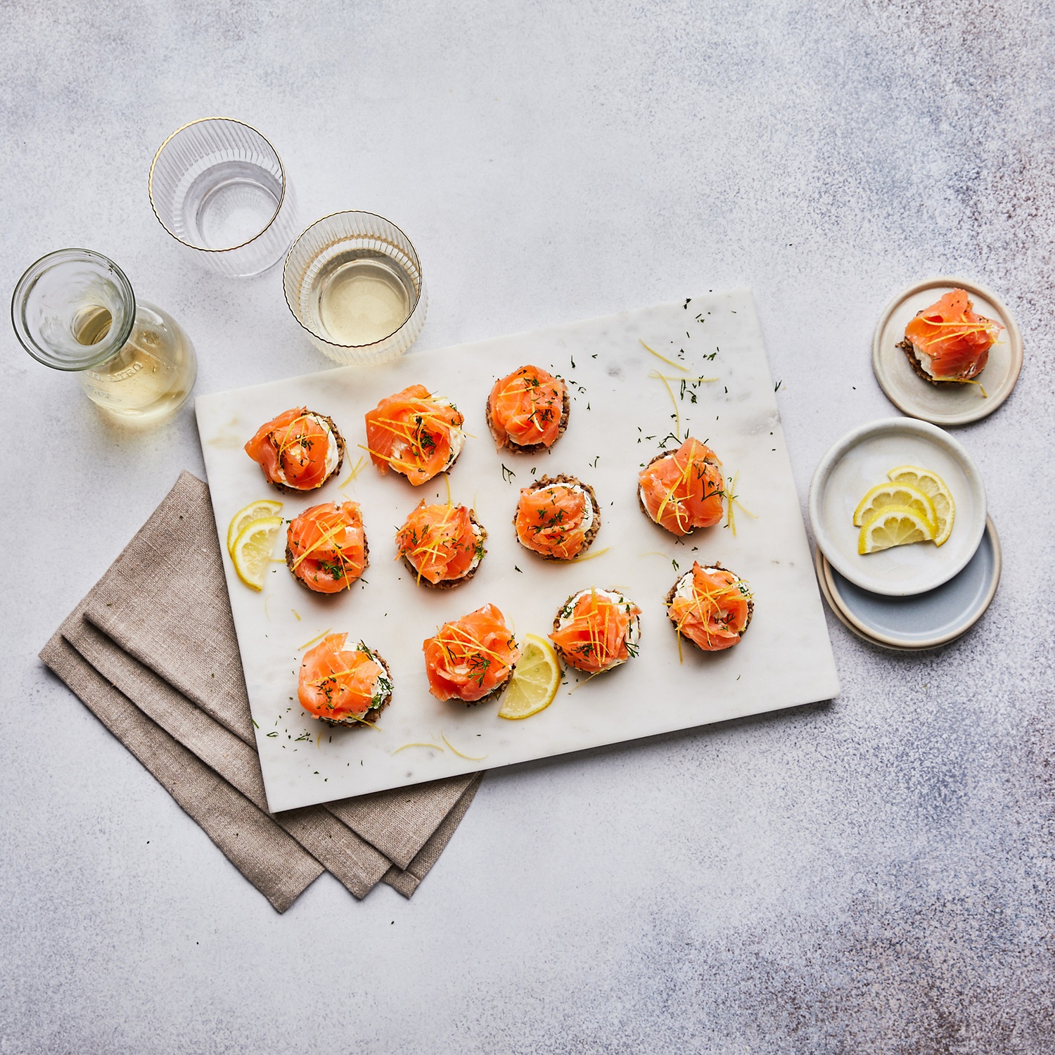 - Den Räucherlachs in dünne Streifen schneiden und vorsichtig auf die Zitronen-Creme legen. Die Canapés mit den Zitronenzesten garnieren.