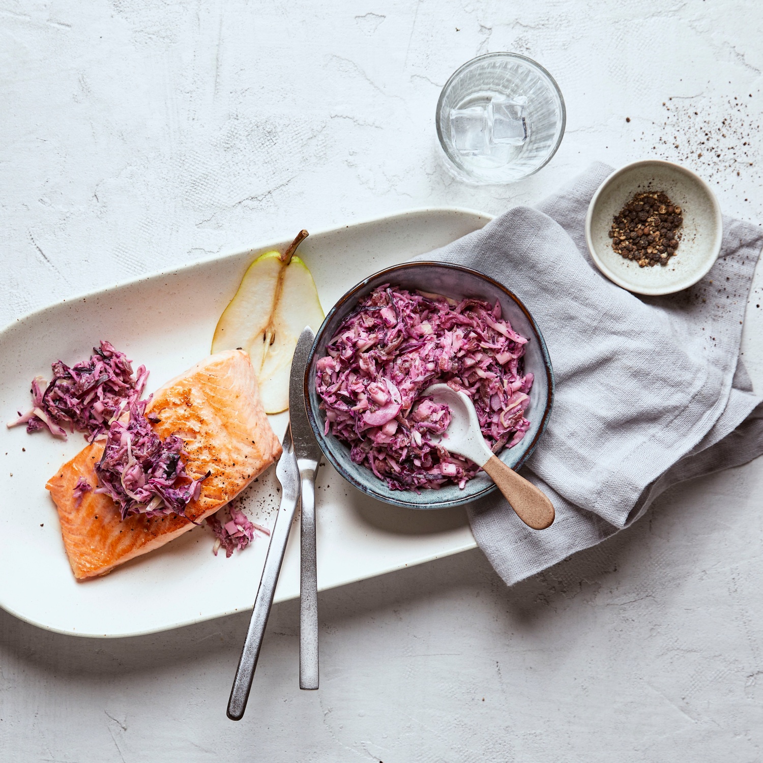Gebratener Lachs mit raffiniertem Krautsalat. Der leichte Pink Coleslaw ist schnell gemacht und überzeugt mit Herbstgemüse von Rotkohl bis Rote Bete. Zum Rezept