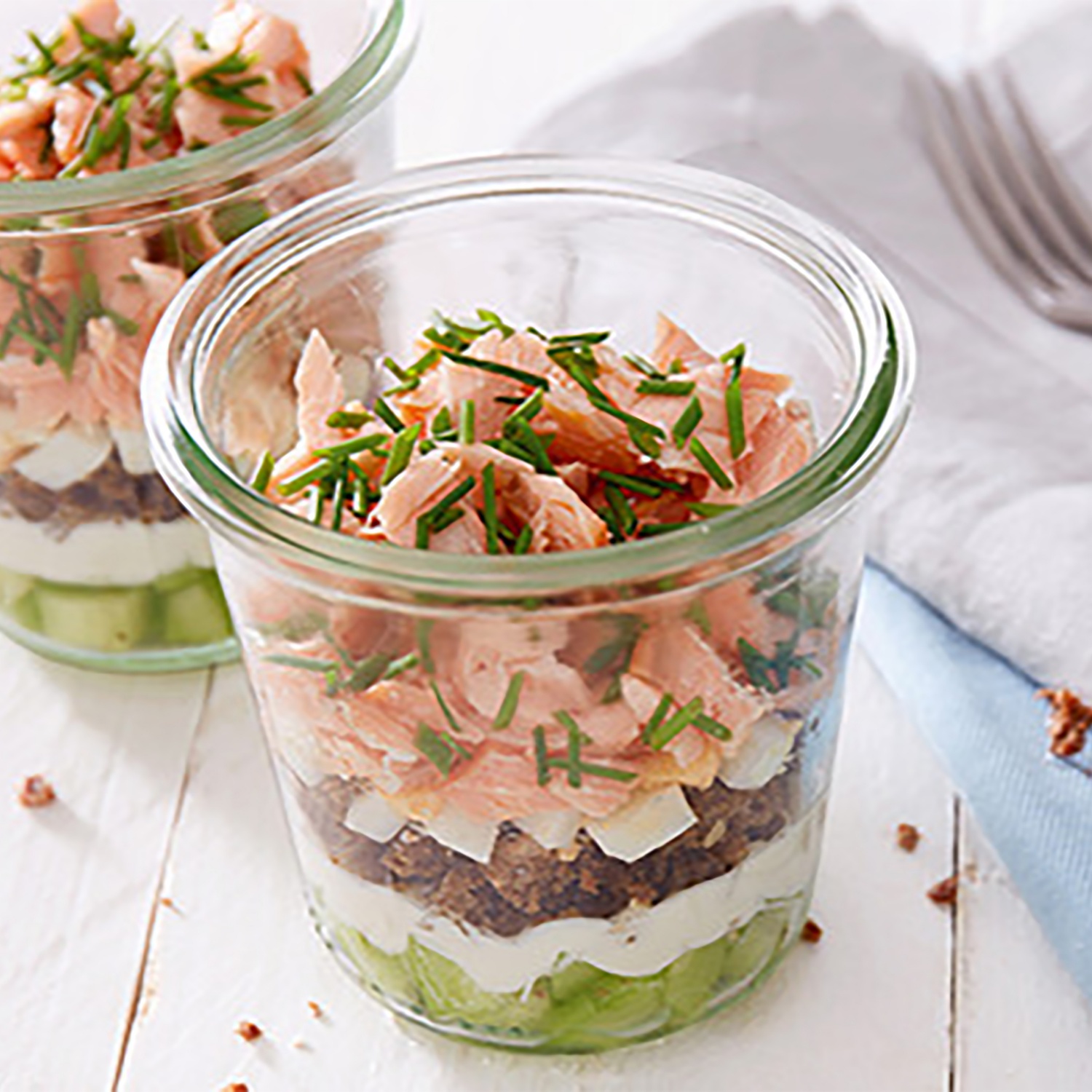 Vollkornbrot zerkrümeln und auf den Frischkäse streuen. Eier kochen, schälen und in Würfel geschnitten auf das Brot streuen. Zum Schluss den Lachs zerzupfen und auf die Eier legen.