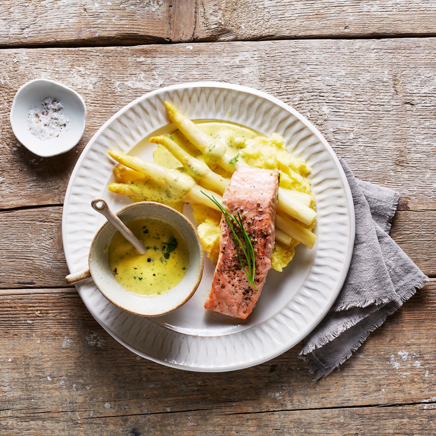 Lachsfilet mit weißem Spargel, Kräuterschaum und Stampfkartoffeln