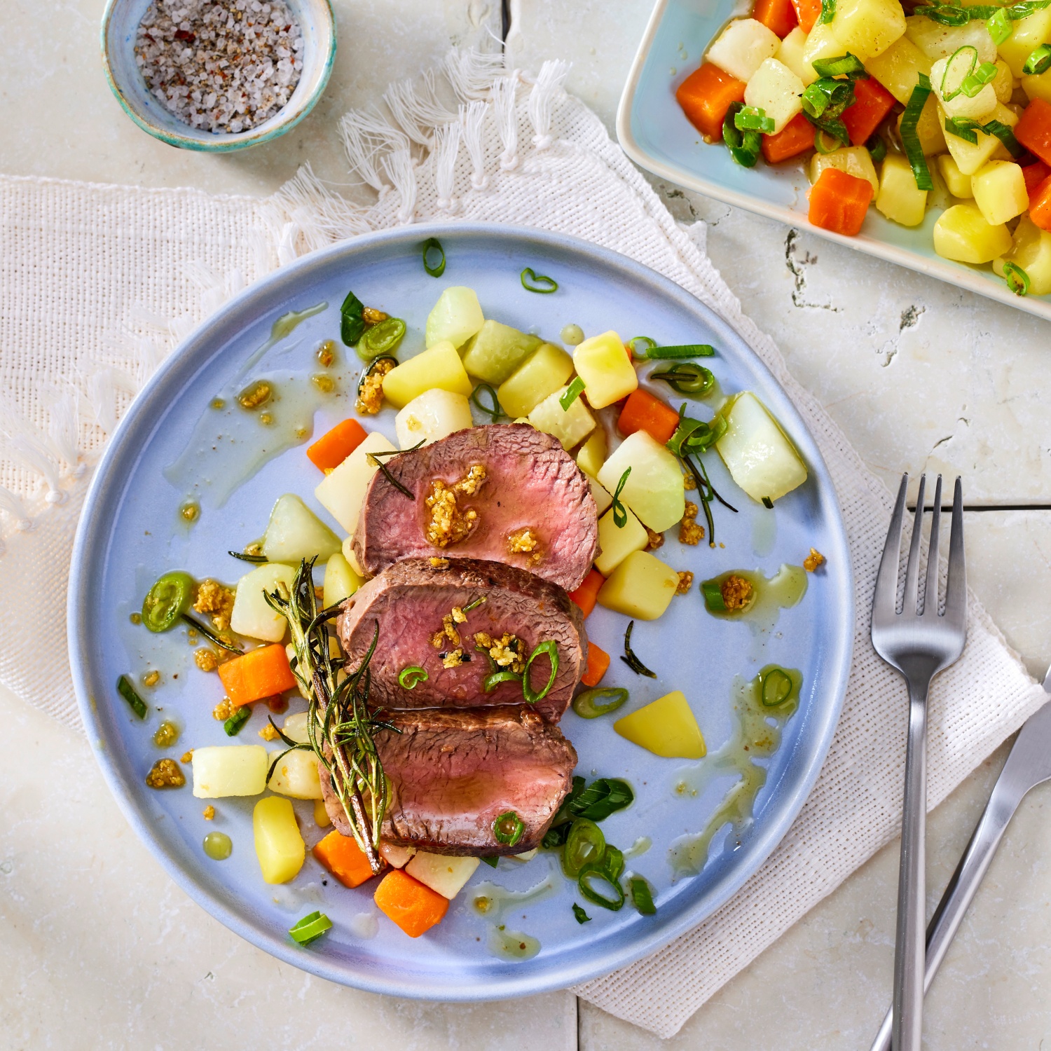 Lamm-Steaks mit Gemüse Dreierlei lädt zum schlemmen ein. Das zarte Fleisch in Kombination mit Möhren, Kohlrabi und Kartoffeln bietet ein wunderbares Geschmackserlebnis. Zum Rezept