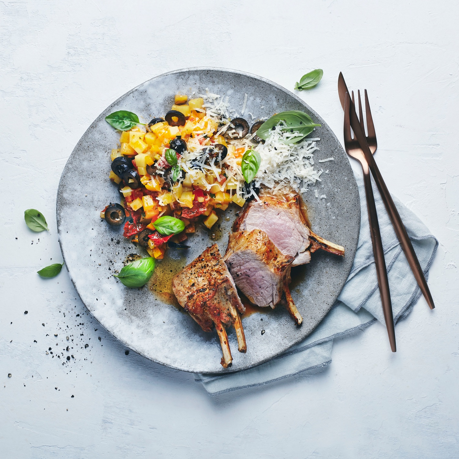 - Das Lammkarree mit dem mediterranem Kartoffelragout anrichten. Mit frischem Basilikum garniert servieren.