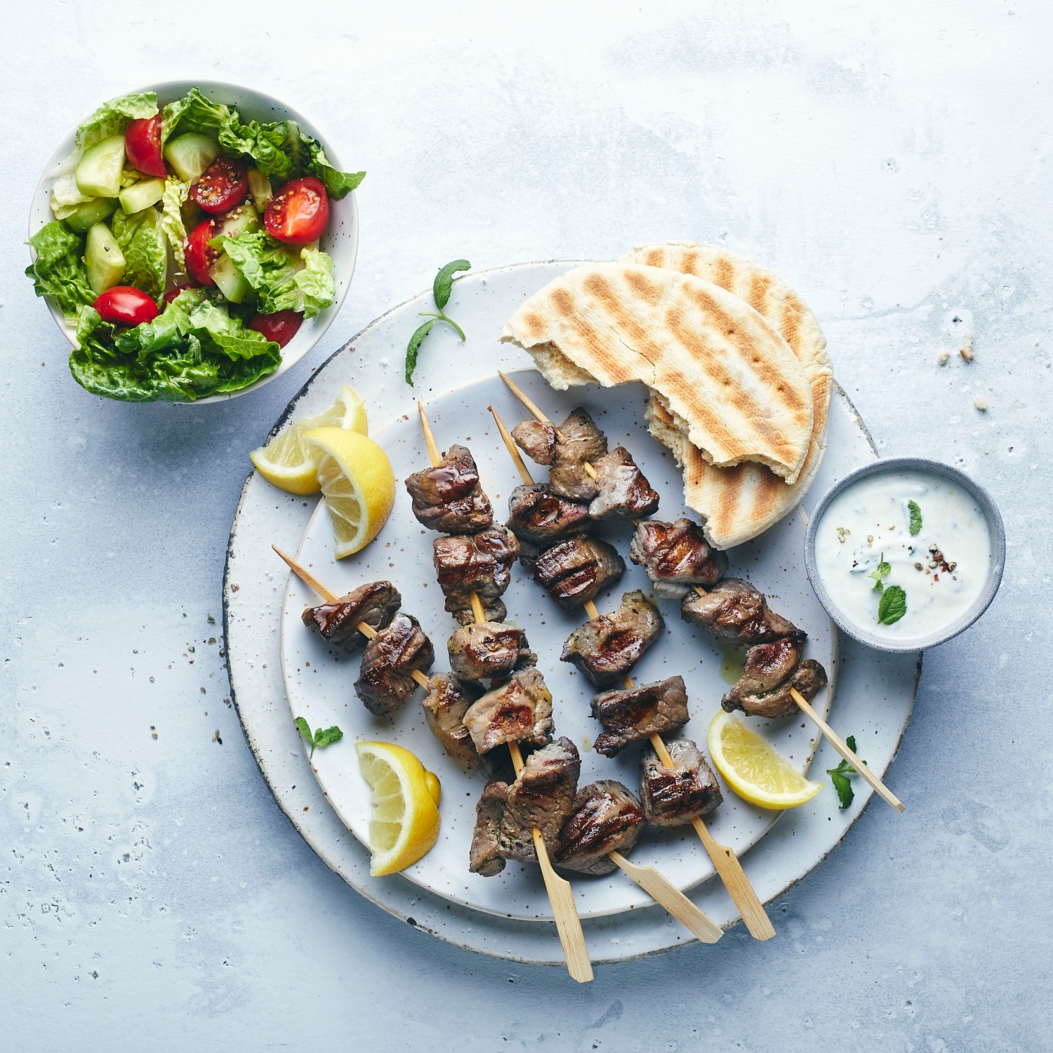 - Den vorbereiteten Salat in der Schüssel mit Salz, Pfeffer und dem Olivenöl würzen. Zitrone vierteln. Pitabrot kurz auf dem Grill von beiden Seiten erwärmen und zusammen mit den fertig gegrillten Lammspießen, dem Salat, Joghurtsauce und Zitronenvierteln servieren.